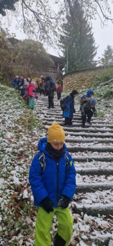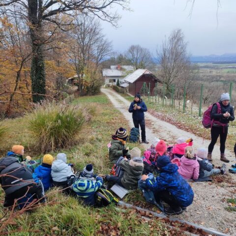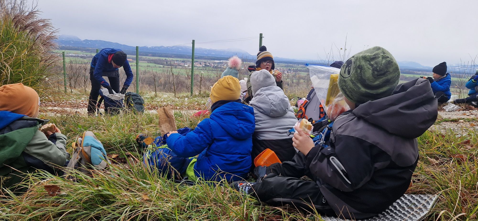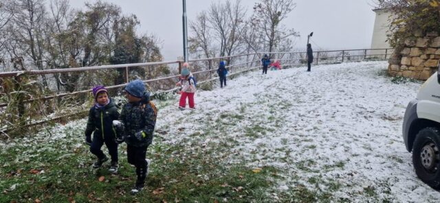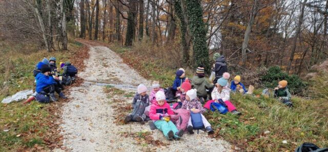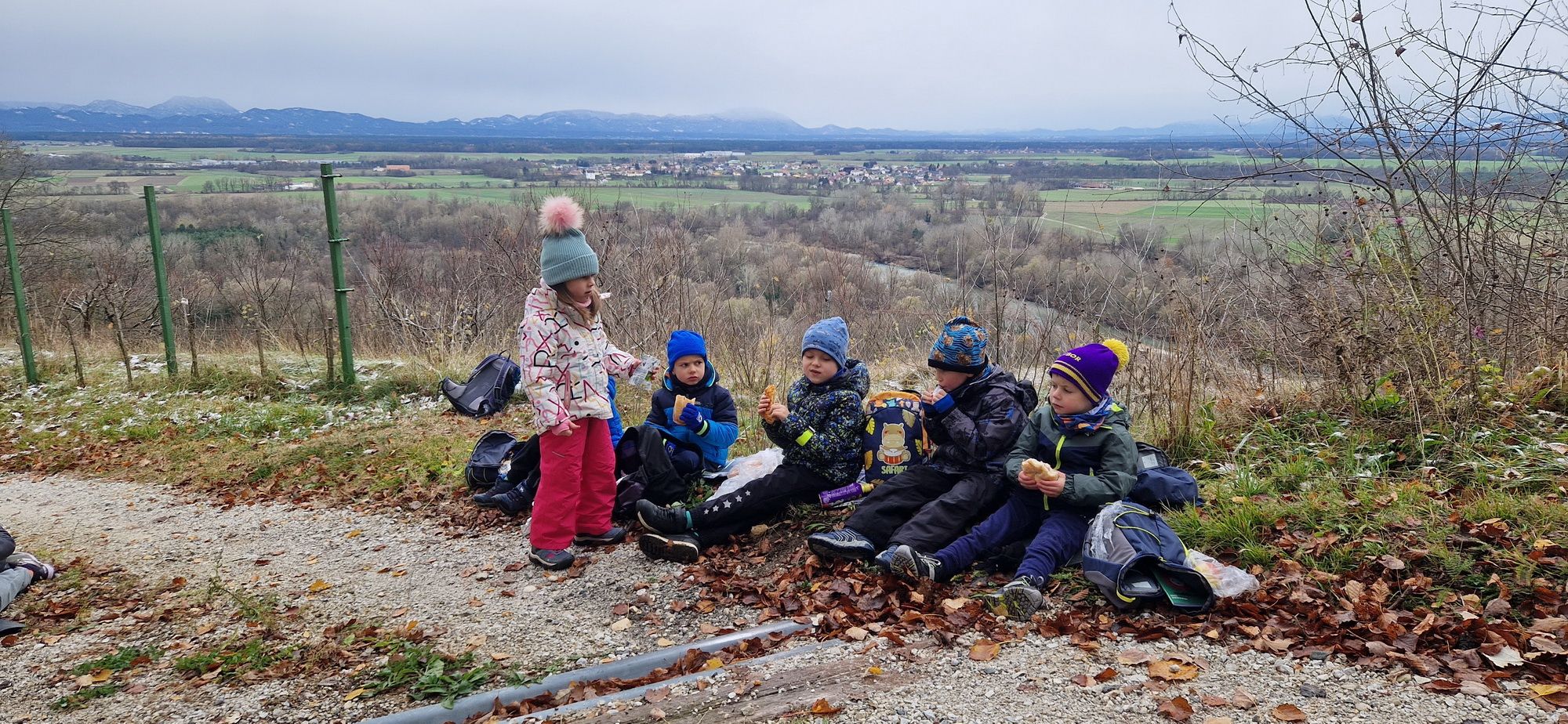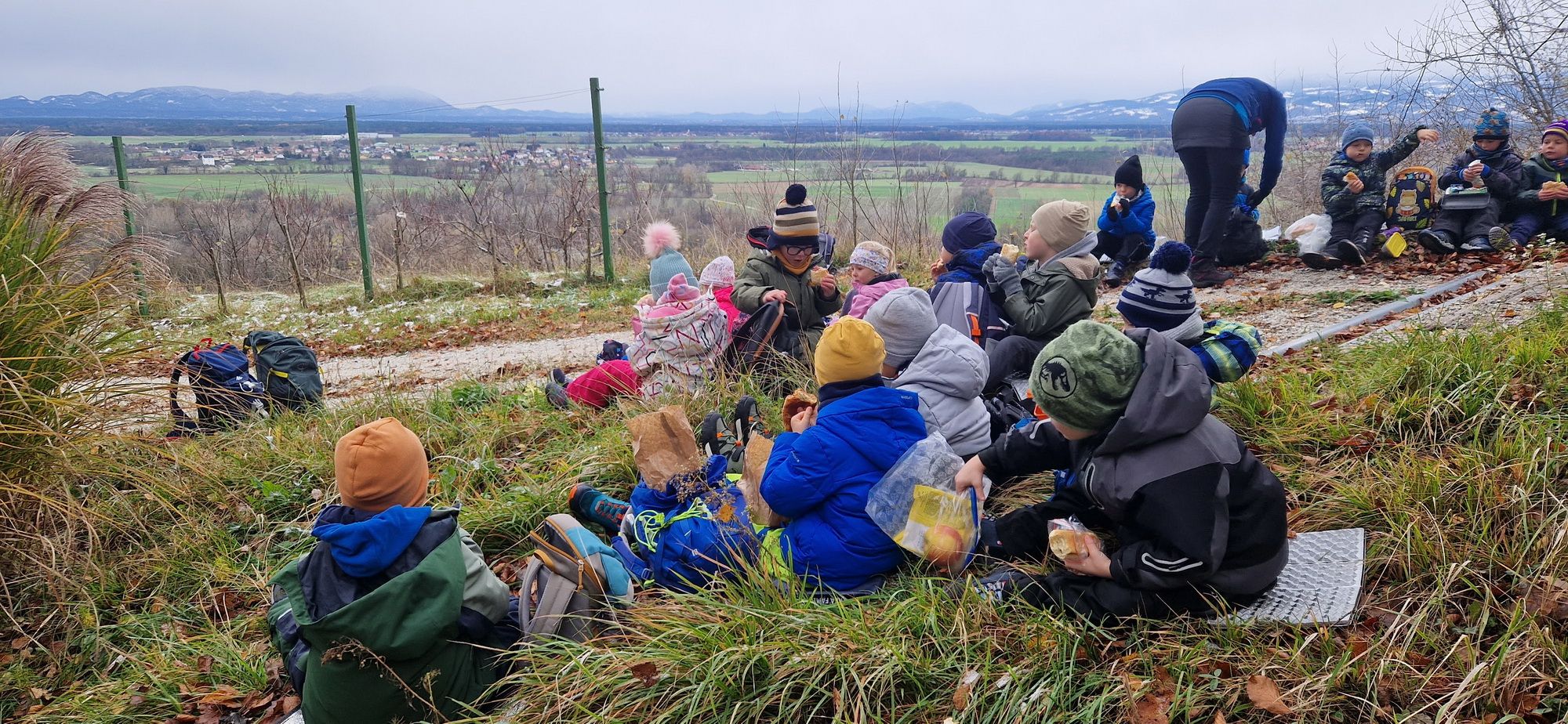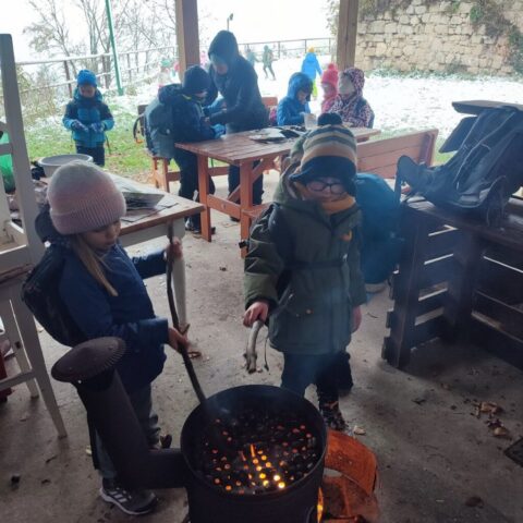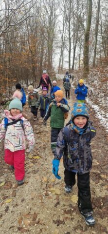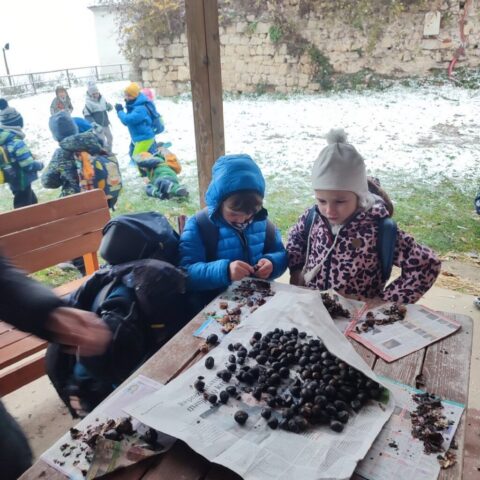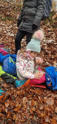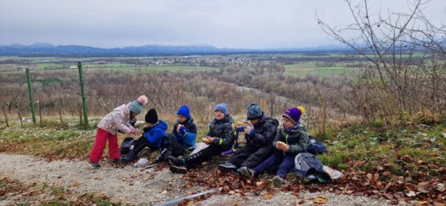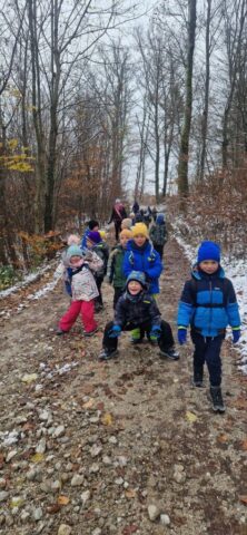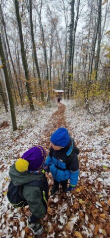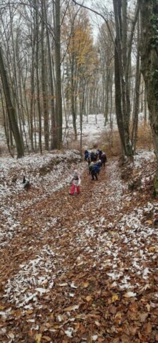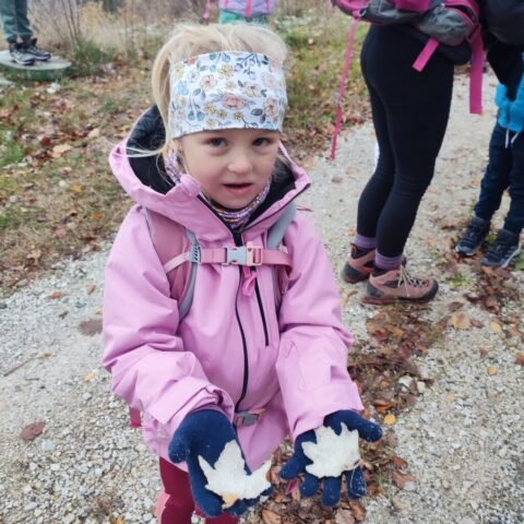 Fotoutrinki s sobotnega, zelo lepega izleta. Upali smo na jesenski izlet, a dobili zgodnje-zimskega. Pozdravilo nas je hladno jutro, a se nismo dali, kmalu smo jo urezali v hrib, se malo zadihali, da nam je postalo toplo in že je bil čas za zajtrk. V ozadju so nas spremljale meglice, a kljub temu smo lahko videli kar daleč, tla so bila rahlo pobeljena, a to nas ni ustavilo, da se ne bi v gozdu tudi poigrali in plezali po strmih hribčkih in koreninah. Kmalu smo prispeli na vrh, kjer smo se z rdečimi lici najprej odpravili na toplo in se konkretno pogreli pri Hudi Lizi. Tudi prigriznili smo, kar je še ostalo. Zunaj pa se je že razplamtel ogenj, kjer so se pekli kostanji. Odpravili smo se na pokušino poznojesenskih kostanjev in uživali v igri na snegu in kepanju. Otroci so res uživali in zelo luštno jih je bilo opazovati v spontani igri. Narava je resnično najboljše igrišče.