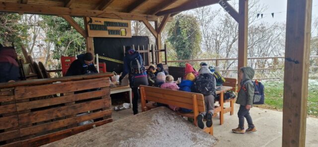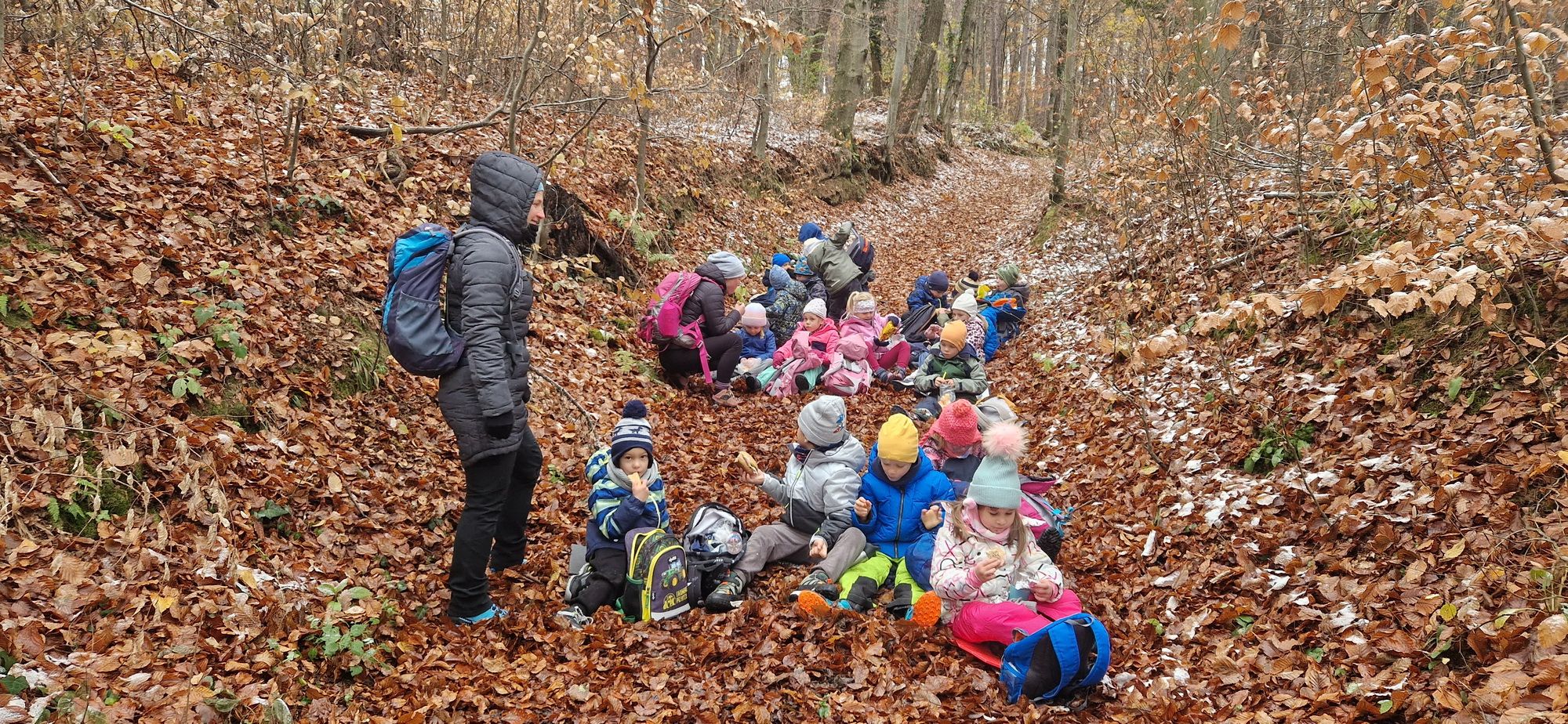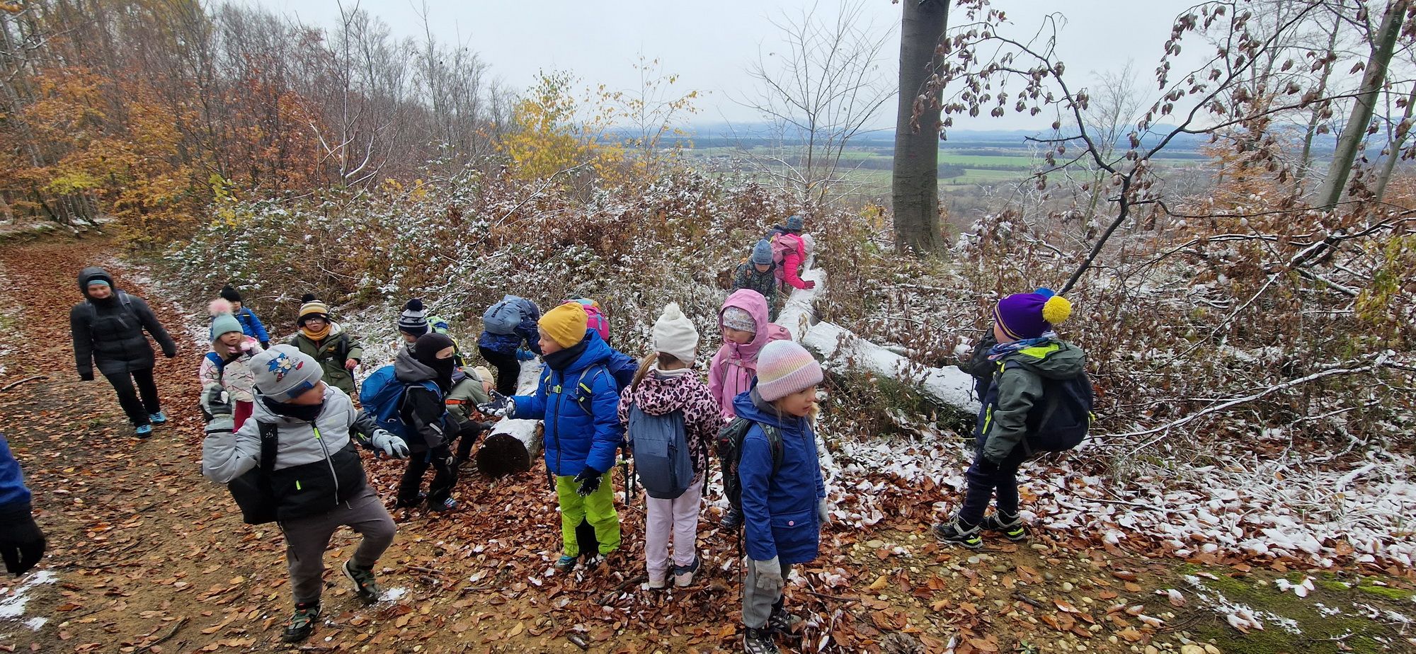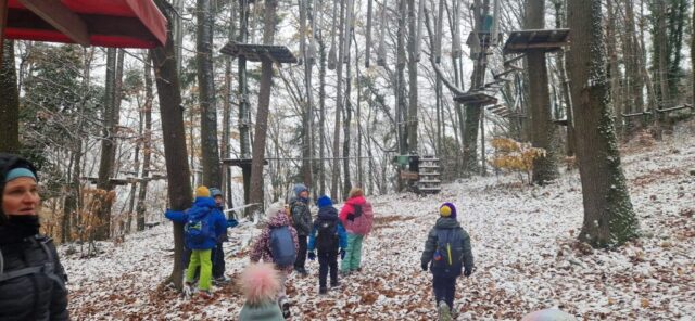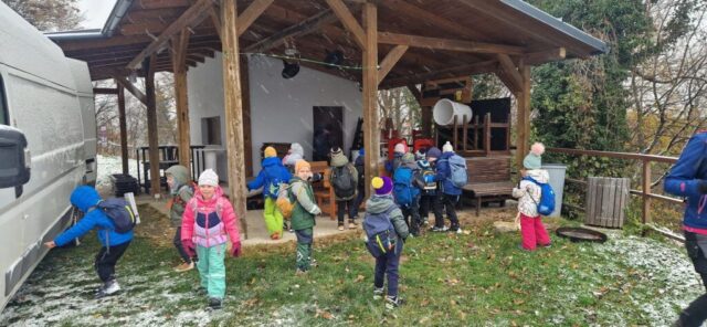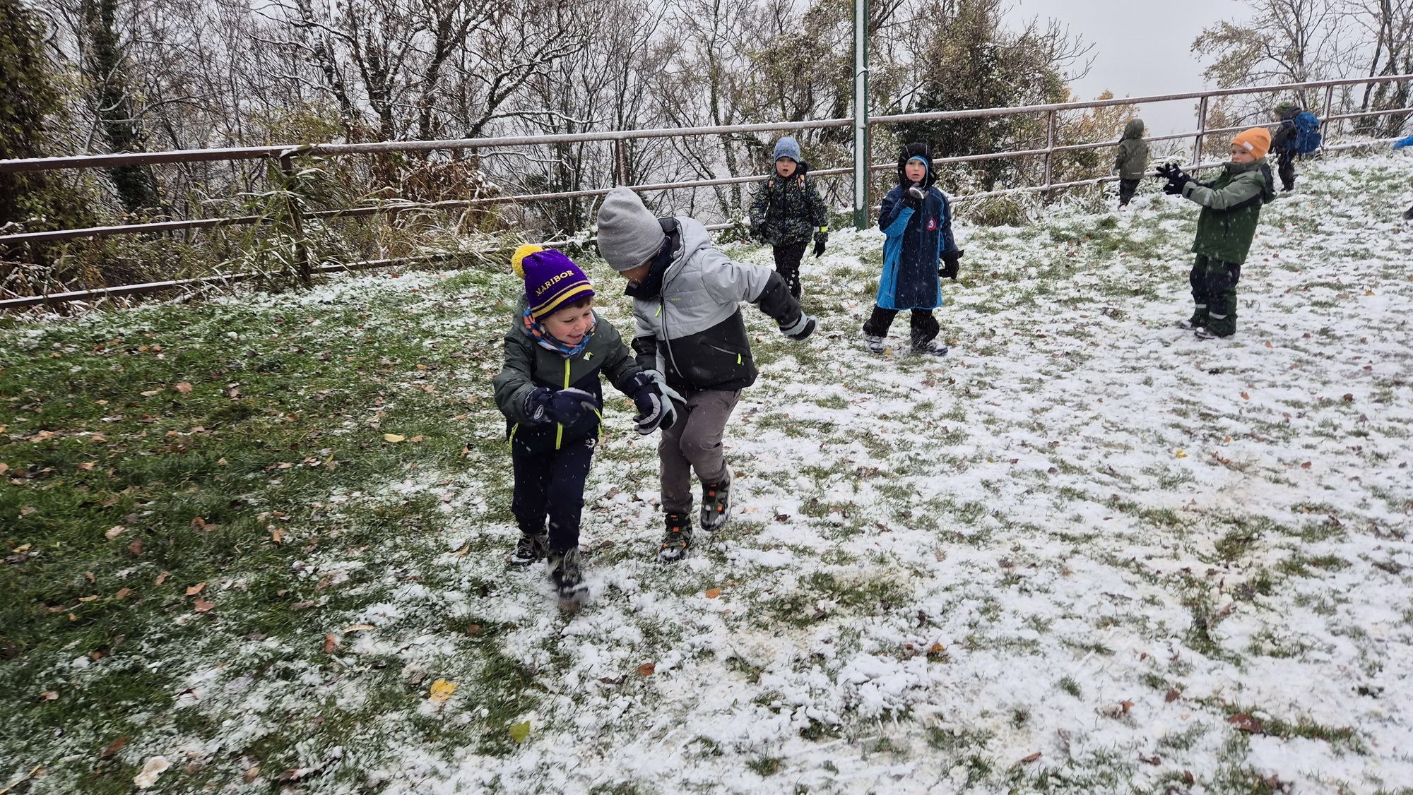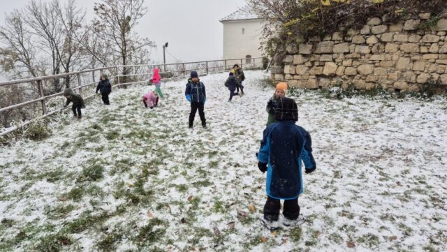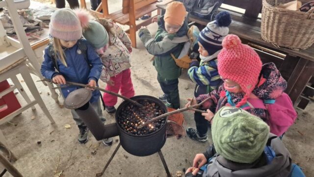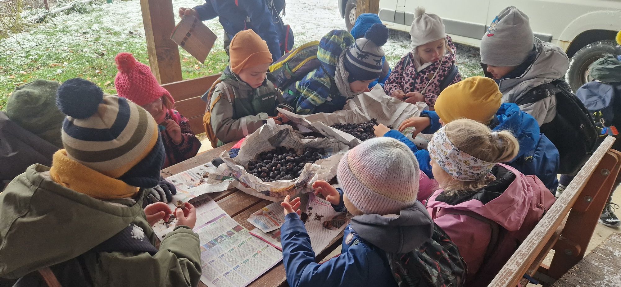 Fotoutrinki s sobotnega, zelo lepega izleta. Upali smo na jesenski izlet, a dobili zgodnje-zimskega. Pozdravilo nas je hladno jutro, a se nismo dali, kmalu smo jo urezali v hrib, se malo zadihali, da nam je postalo toplo in že je bil čas za zajtrk. V ozadju so nas spremljale meglice, a kljub temu smo lahko videli kar daleč, tla so bila rahlo pobeljena, a to nas ni ustavilo, da se ne bi v gozdu tudi poigrali in plezali po strmih hribčkih in koreninah. Kmalu smo prispeli na vrh, kjer smo se z rdečimi lici najprej odpravili na toplo in se konkretno pogreli pri Hudi Lizi. Tudi prigriznili smo, kar je še ostalo. Zunaj pa se je že razplamtel ogenj, kjer so se pekli kostanji. Odpravili smo se na pokušino poznojesenskih kostanjev in uživali v igri na snegu in kepanju. Otroci so res uživali in zelo luštno jih je bilo opazovati v spontani igri. Narava je resnično najboljše igrišče.