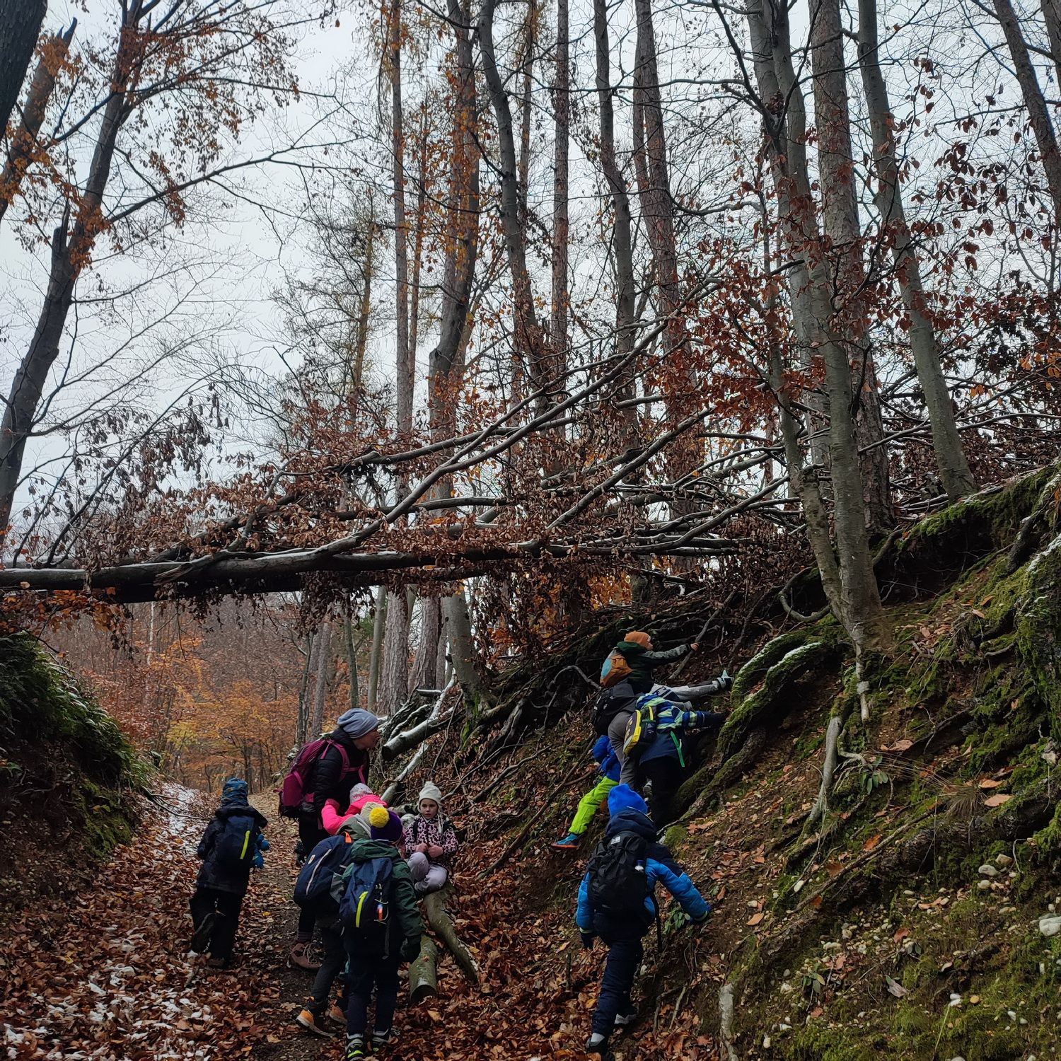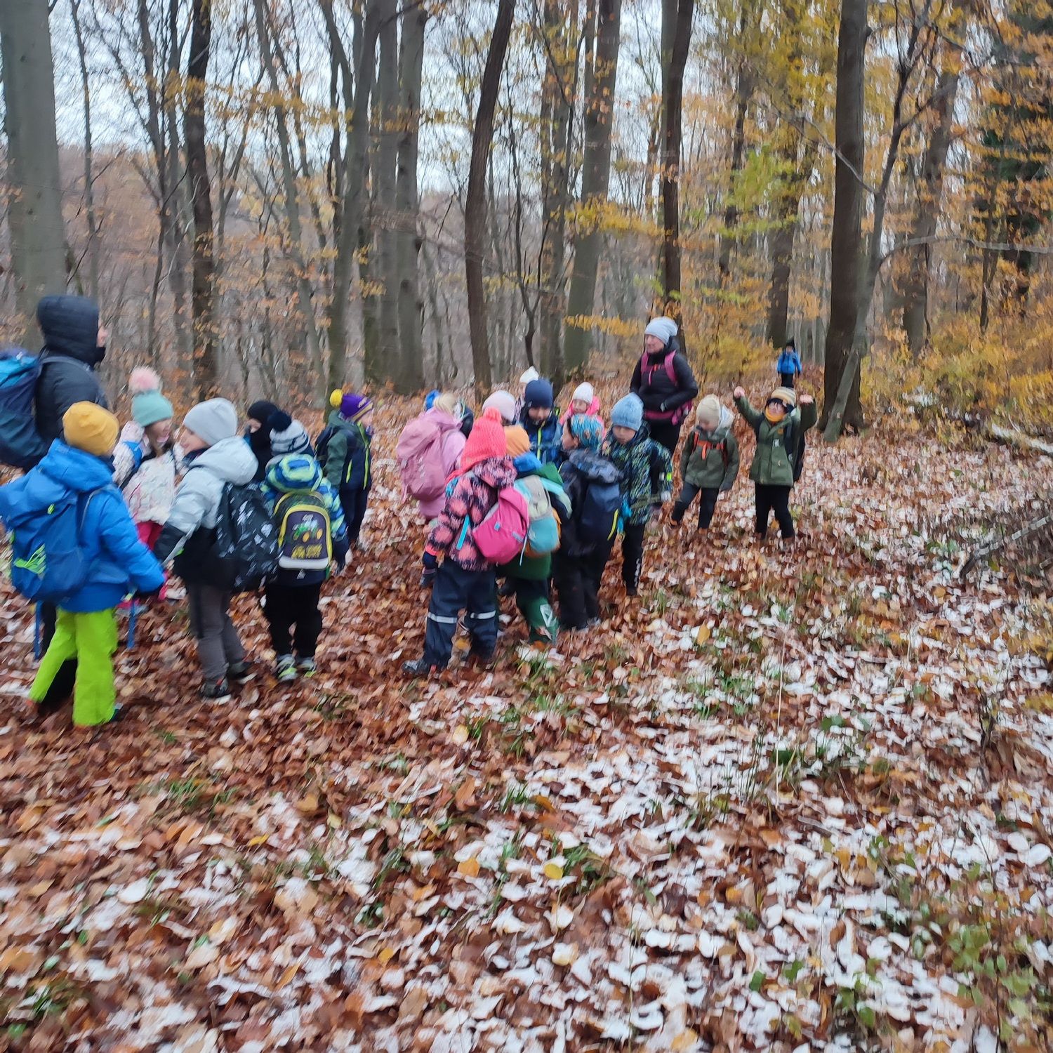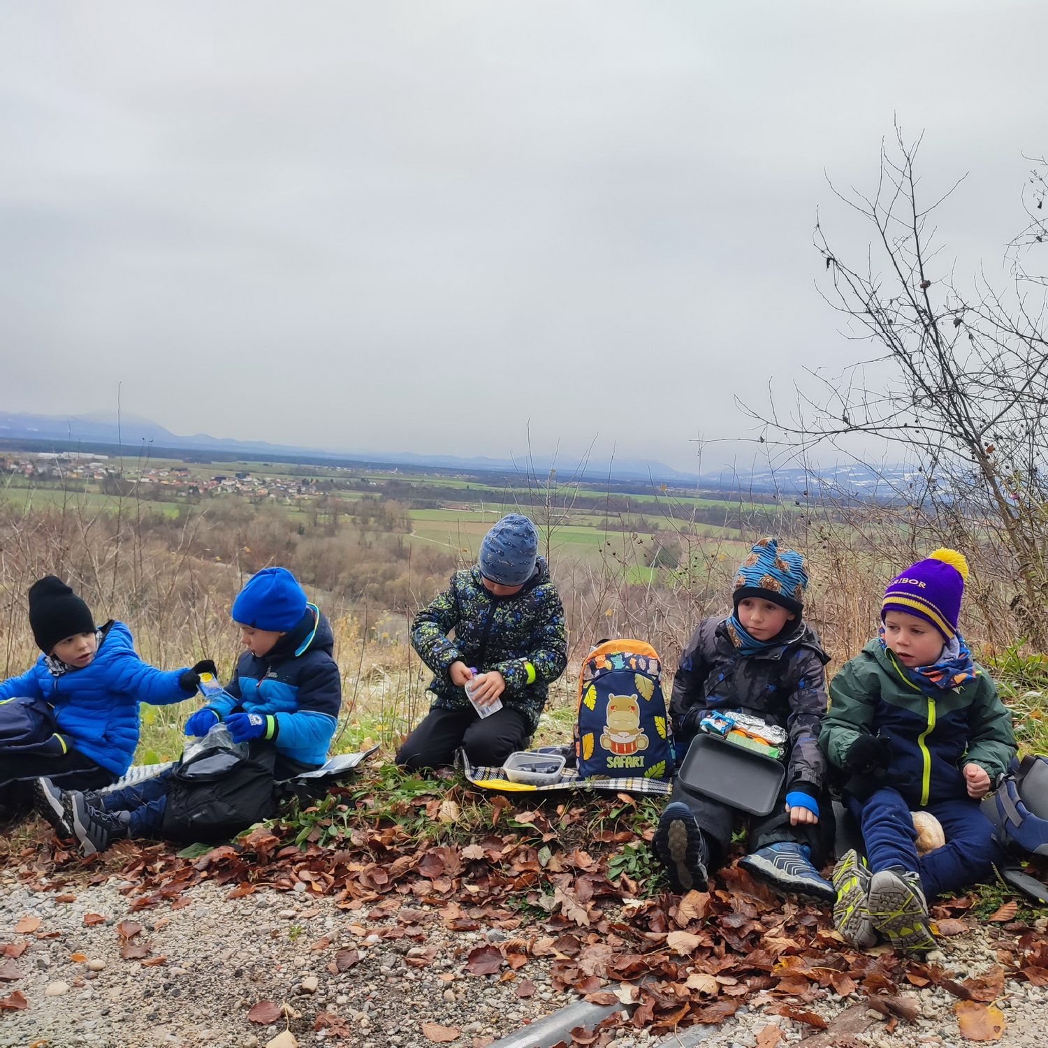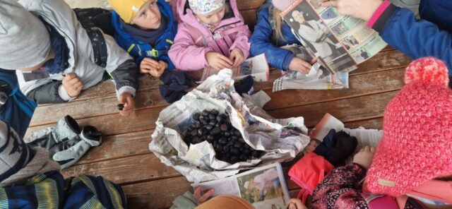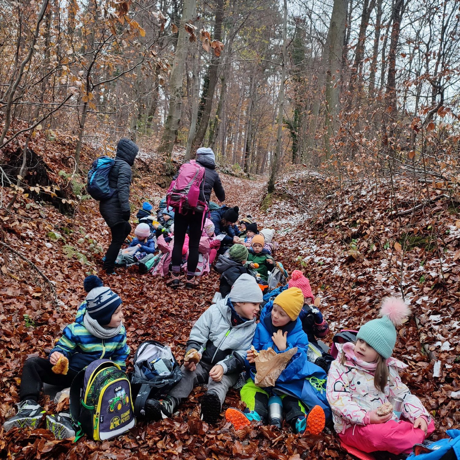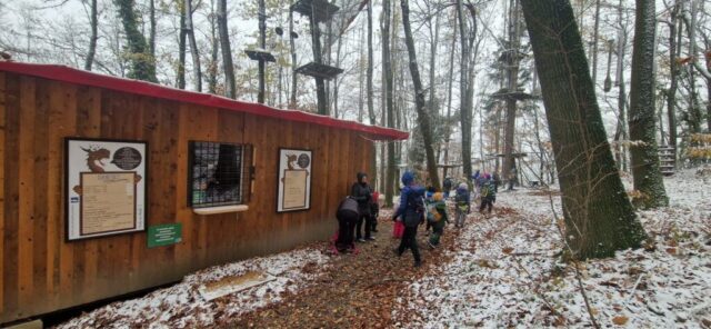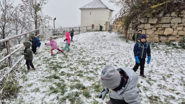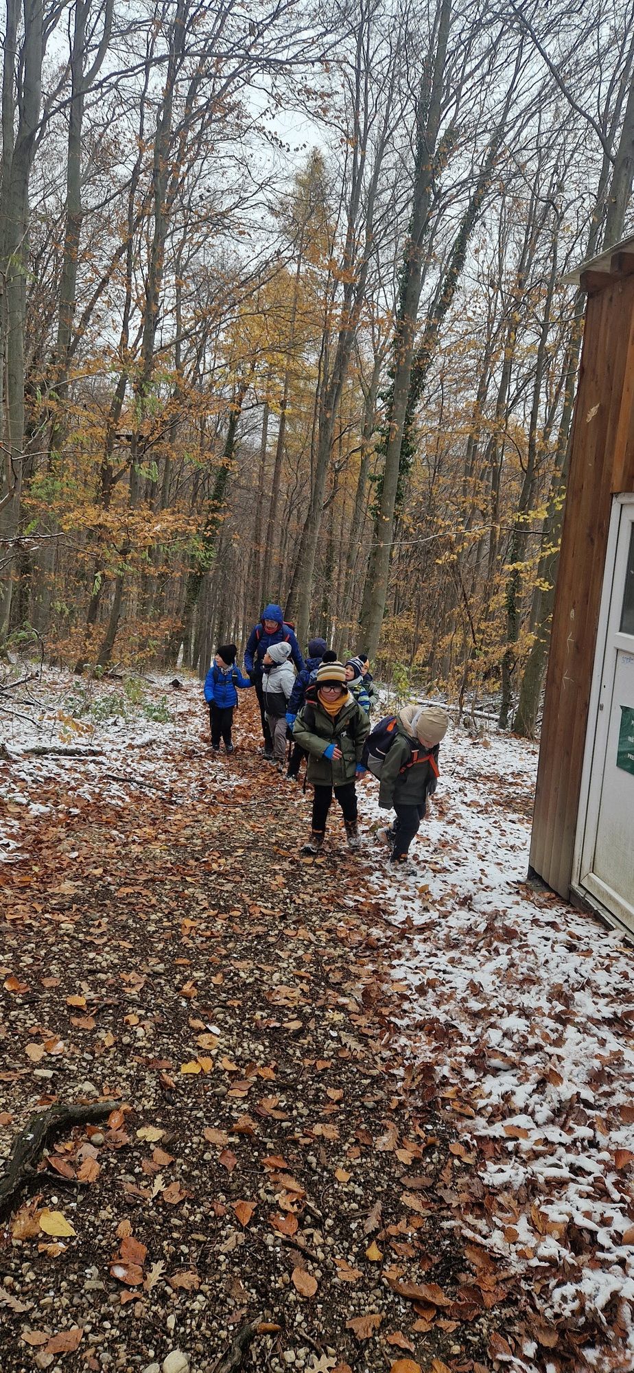 Fotoutrinki s sobotnega, zelo lepega izleta. Upali smo na jesenski izlet, a dobili zgodnje-zimskega. Pozdravilo nas je hladno jutro, a se nismo dali, kmalu smo jo urezali v hrib, se malo zadihali, da nam je postalo toplo in že je bil čas za zajtrk. V ozadju so nas spremljale meglice, a kljub temu smo lahko videli kar daleč, tla so bila rahlo pobeljena, a to nas ni ustavilo, da se ne bi v gozdu tudi poigrali in plezali po strmih hribčkih in koreninah. Kmalu smo prispeli na vrh, kjer smo se z rdečimi lici najprej odpravili na toplo in se konkretno pogreli pri Hudi Lizi. Tudi prigriznili smo, kar je še ostalo. Zunaj pa se je že razplamtel ogenj, kjer so se pekli kostanji. Odpravili smo se na pokušino poznojesenskih kostanjev in uživali v igri na snegu in kepanju. Otroci so res uživali in zelo luštno jih je bilo opazovati v spontani igri. Narava je resnično najboljše igrišče.