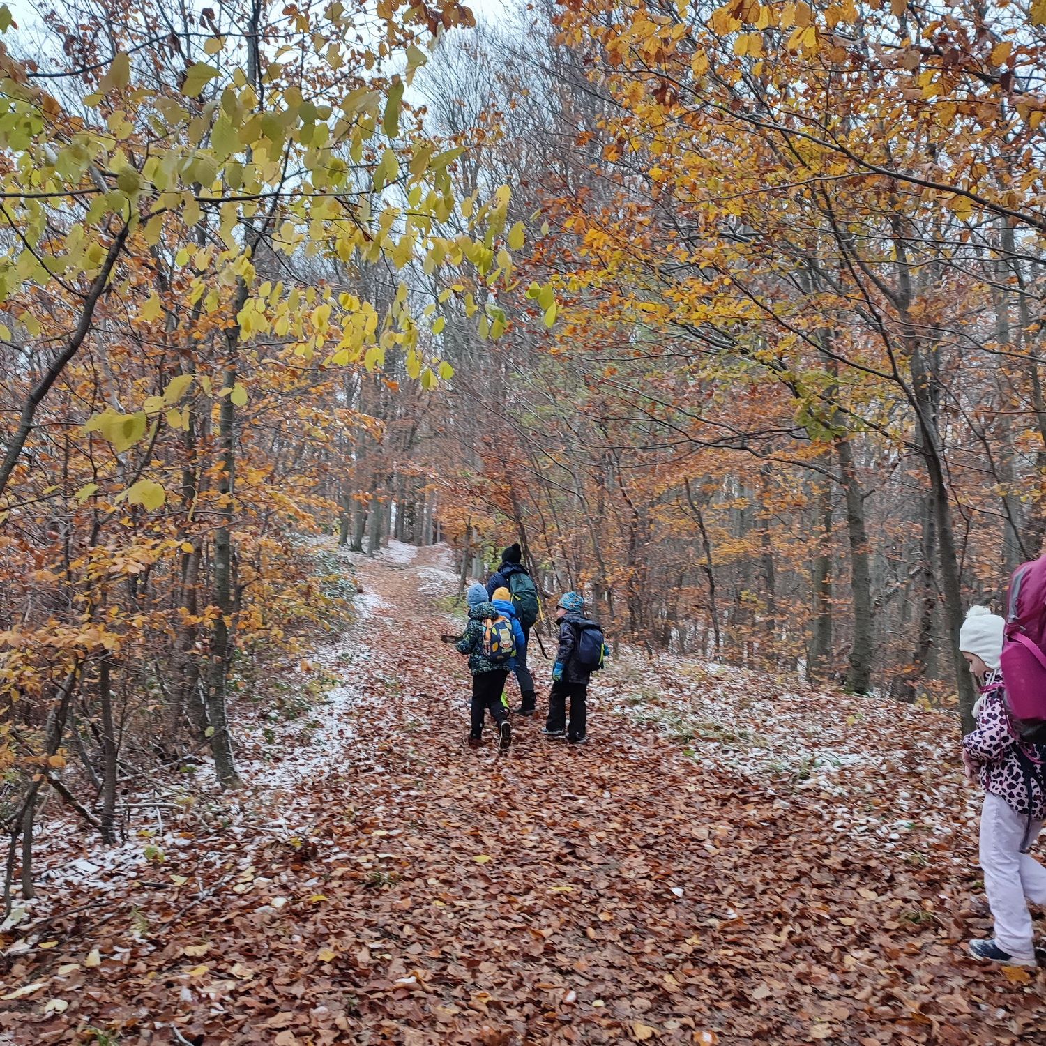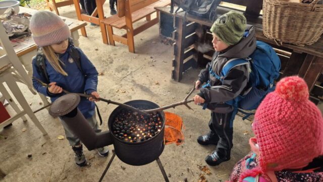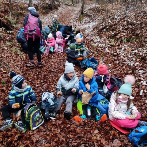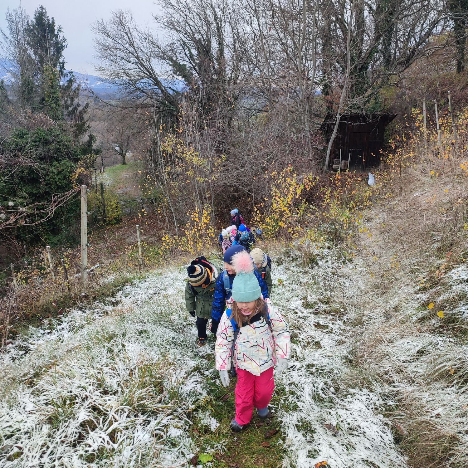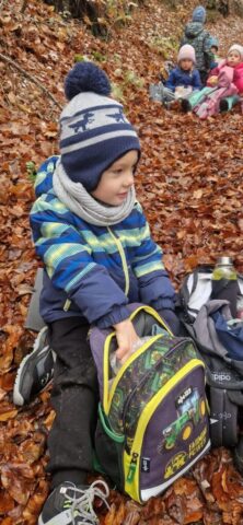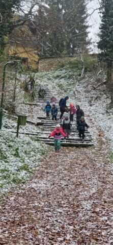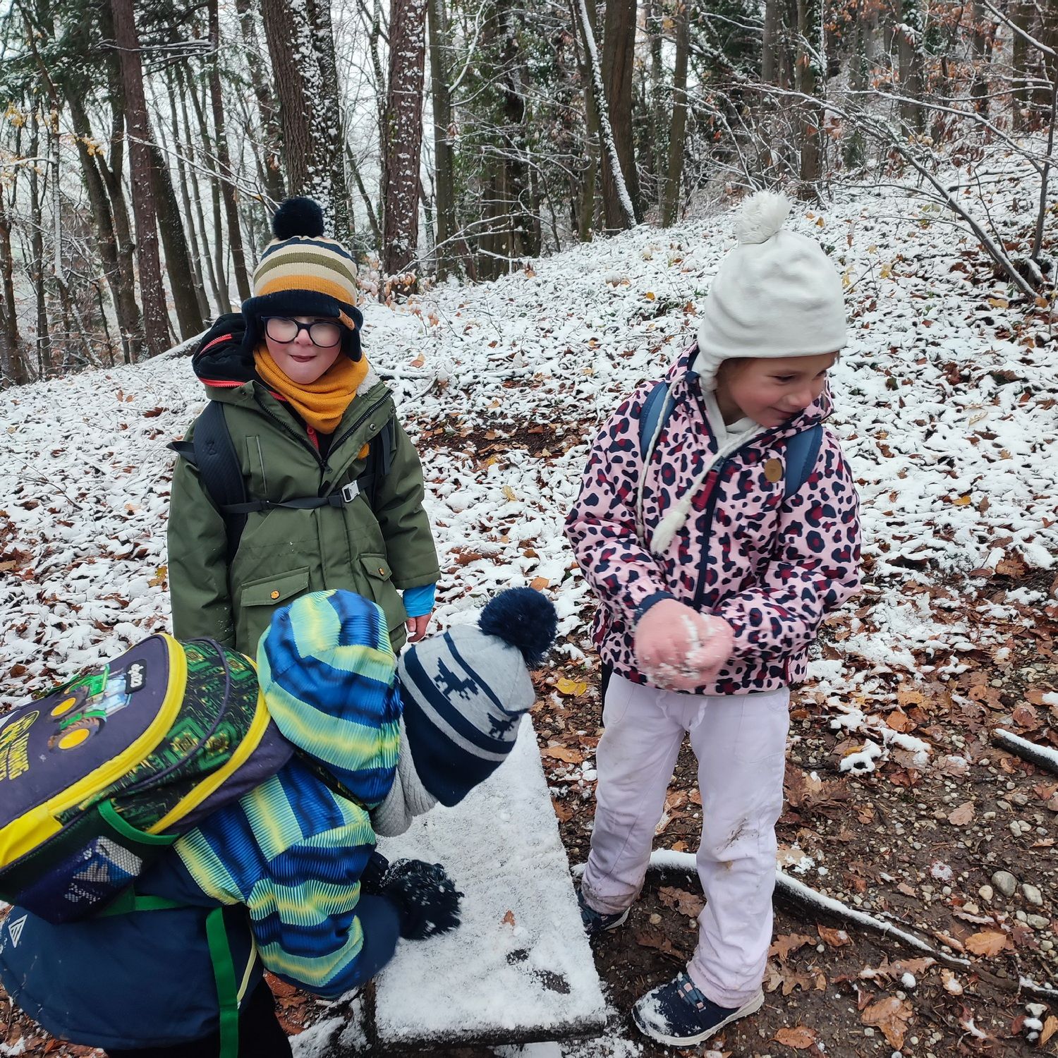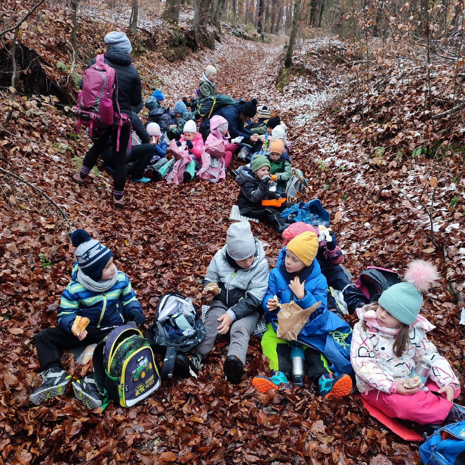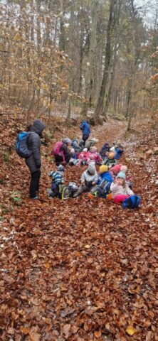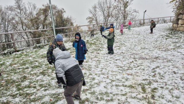 Fotoutrinki s sobotnega, zelo lepega izleta. Upali smo na jesenski izlet, a dobili zgodnje-zimskega. Pozdravilo nas je hladno jutro, a se nismo dali, kmalu smo jo urezali v hrib, se malo zadihali, da nam je postalo toplo in že je bil čas za zajtrk. V ozadju so nas spremljale meglice, a kljub temu smo lahko videli kar daleč, tla so bila rahlo pobeljena, a to nas ni ustavilo, da se ne bi v gozdu tudi poigrali in plezali po strmih hribčkih in koreninah. Kmalu smo prispeli na vrh, kjer smo se z rdečimi lici najprej odpravili na toplo in se konkretno pogreli pri Hudi Lizi. Tudi prigriznili smo, kar je še ostalo. Zunaj pa se je že razplamtel ogenj, kjer so se pekli kostanji. Odpravili smo se na pokušino poznojesenskih kostanjev in uživali v igri na snegu in kepanju. Otroci so res uživali in zelo luštno jih je bilo opazovati v spontani igri. Narava je resnično najboljše igrišče.