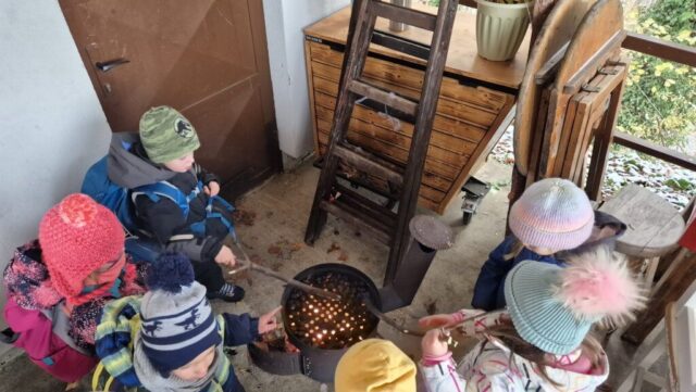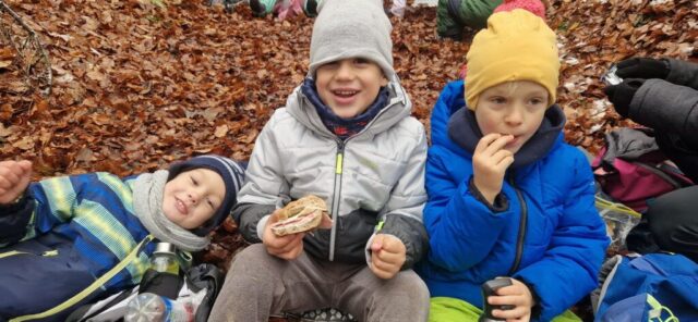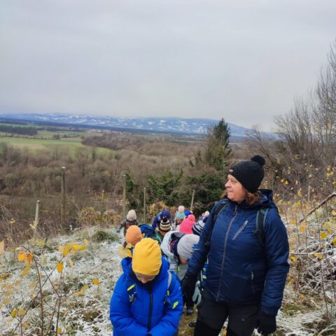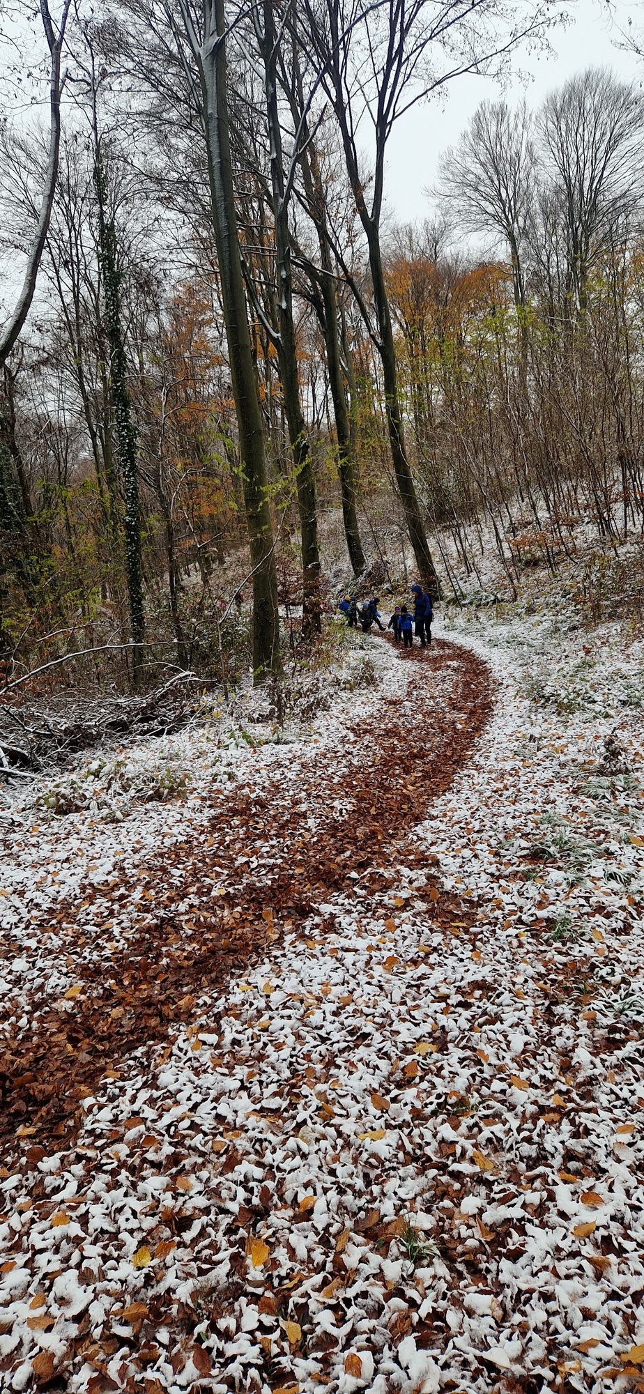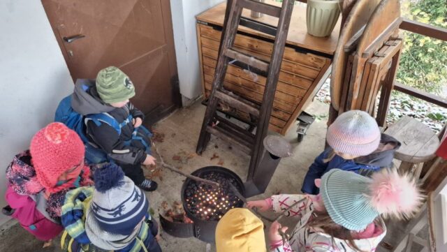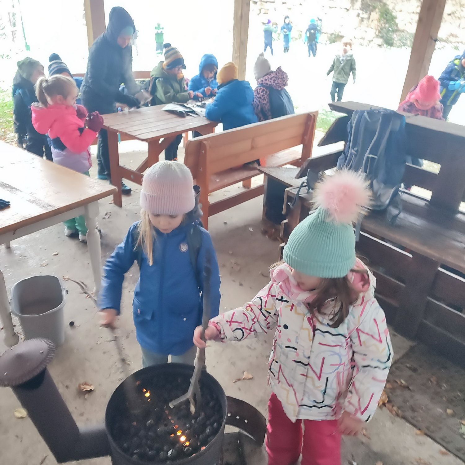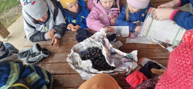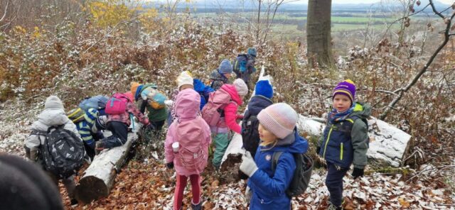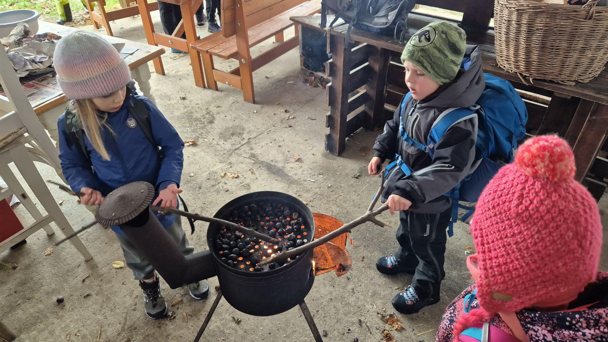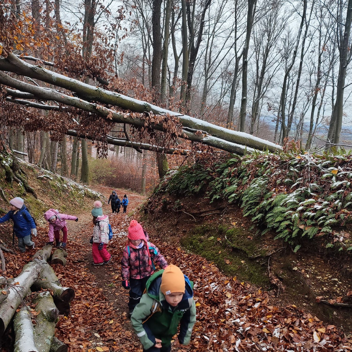 Fotoutrinki s sobotnega, zelo lepega izleta. Upali smo na jesenski izlet, a dobili zgodnje-zimskega. Pozdravilo nas je hladno jutro, a se nismo dali, kmalu smo jo urezali v hrib, se malo zadihali, da nam je postalo toplo in že je bil čas za zajtrk. V ozadju so nas spremljale meglice, a kljub temu smo lahko videli kar daleč, tla so bila rahlo pobeljena, a to nas ni ustavilo, da se ne bi v gozdu tudi poigrali in plezali po strmih hribčkih in koreninah. Kmalu smo prispeli na vrh, kjer smo se z rdečimi lici najprej odpravili na toplo in se konkretno pogreli pri Hudi Lizi. Tudi prigriznili smo, kar je še ostalo. Zunaj pa se je že razplamtel ogenj, kjer so se pekli kostanji. Odpravili smo se na pokušino poznojesenskih kostanjev in uživali v igri na snegu in kepanju. Otroci so res uživali in zelo luštno jih je bilo opazovati v spontani igri. Narava je resnično najboljše igrišče.