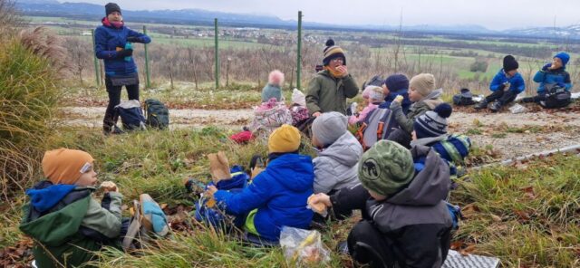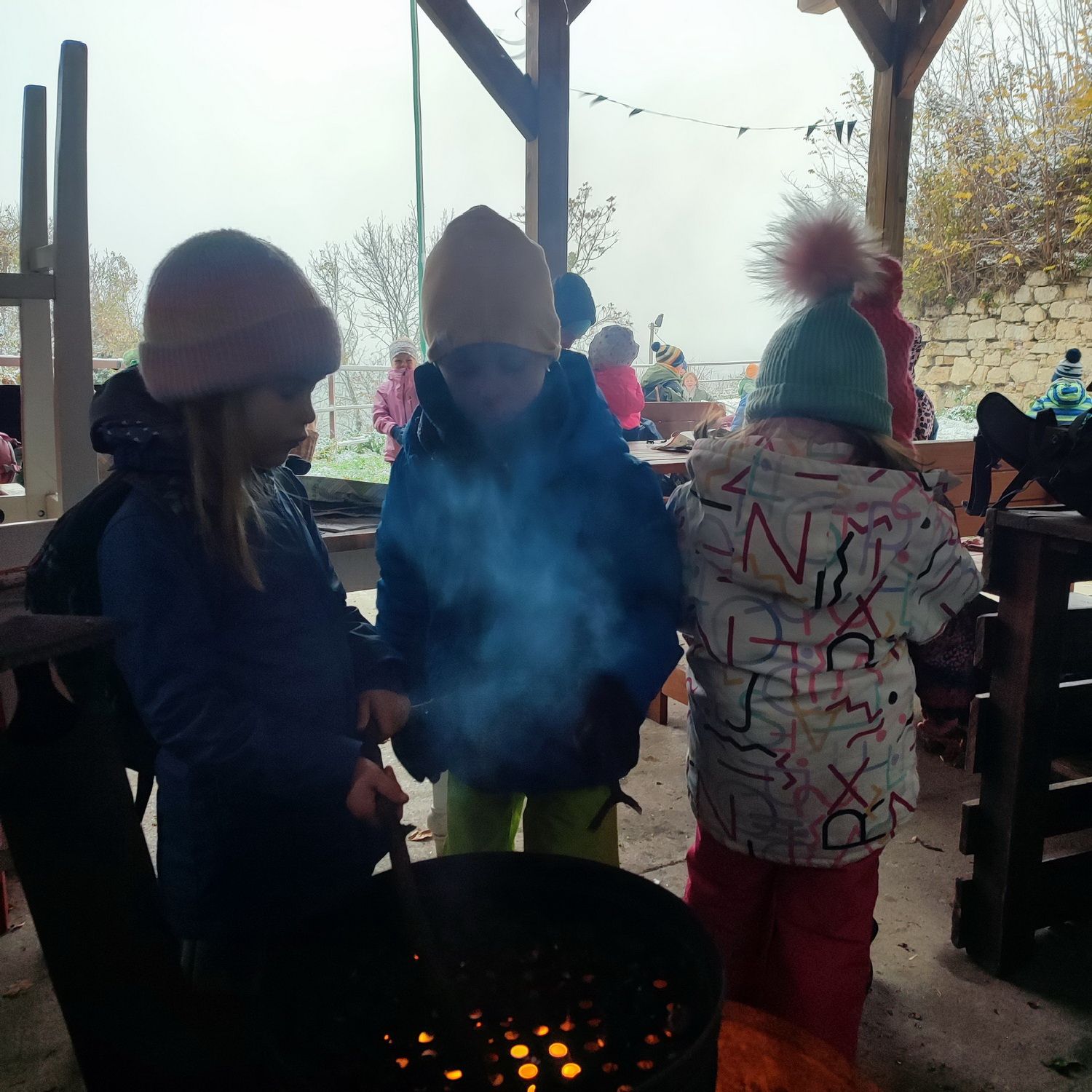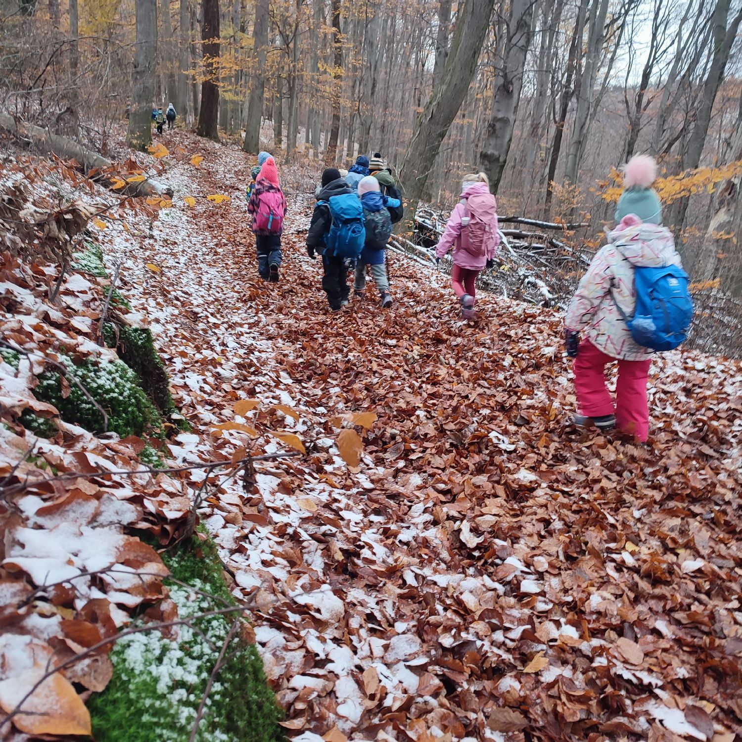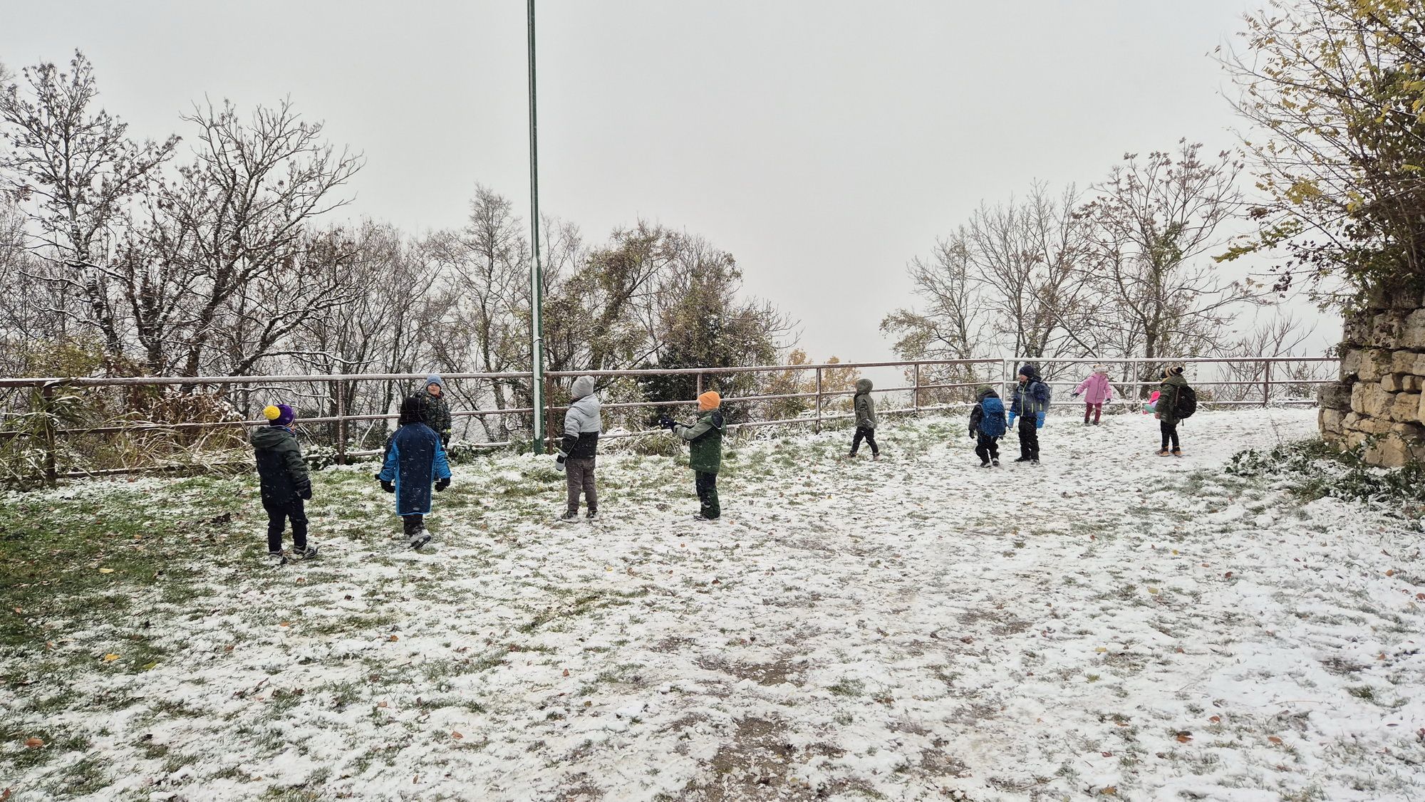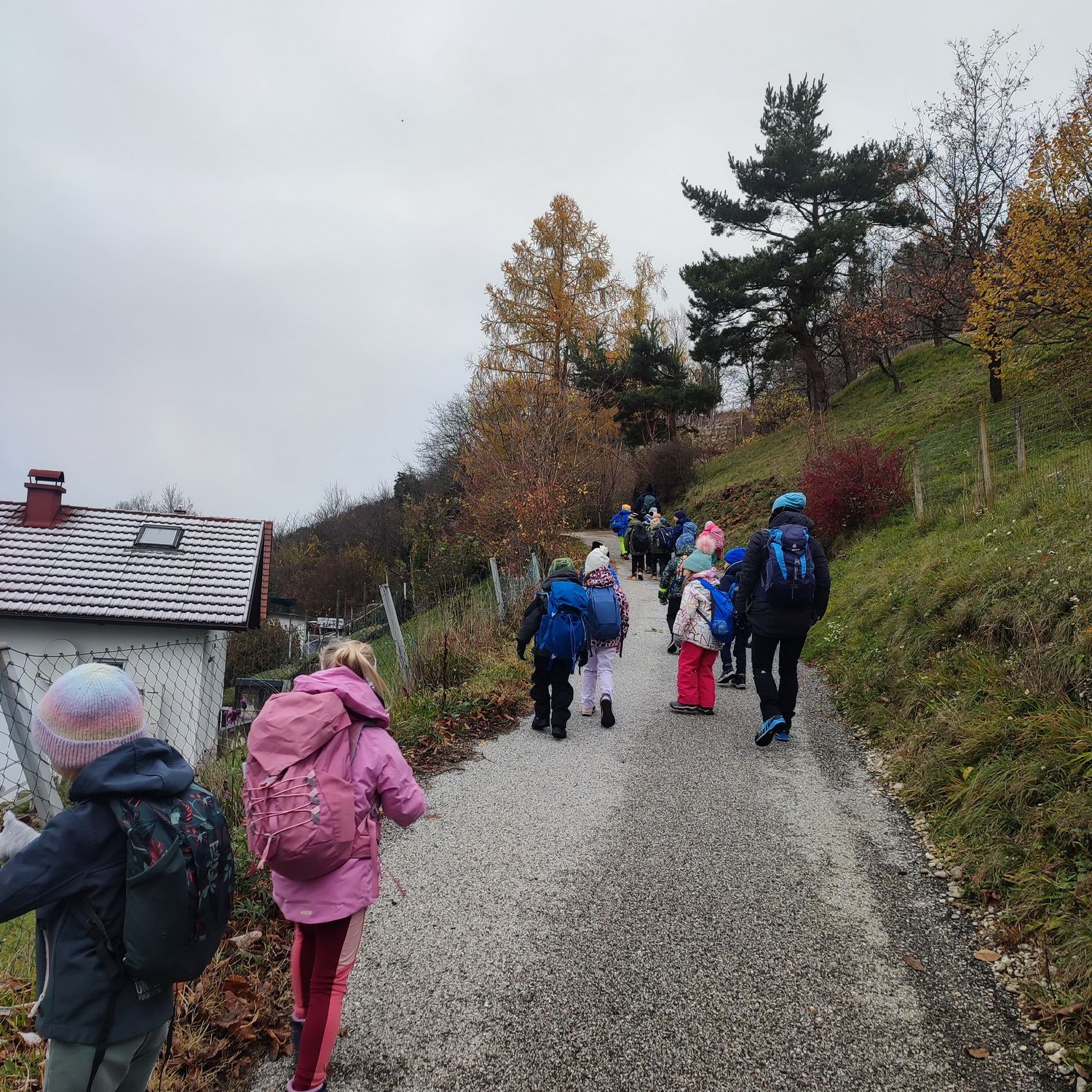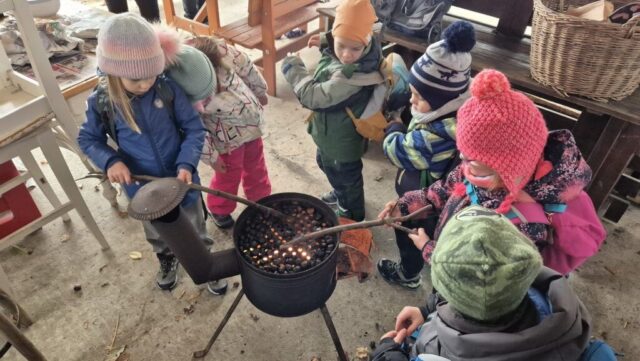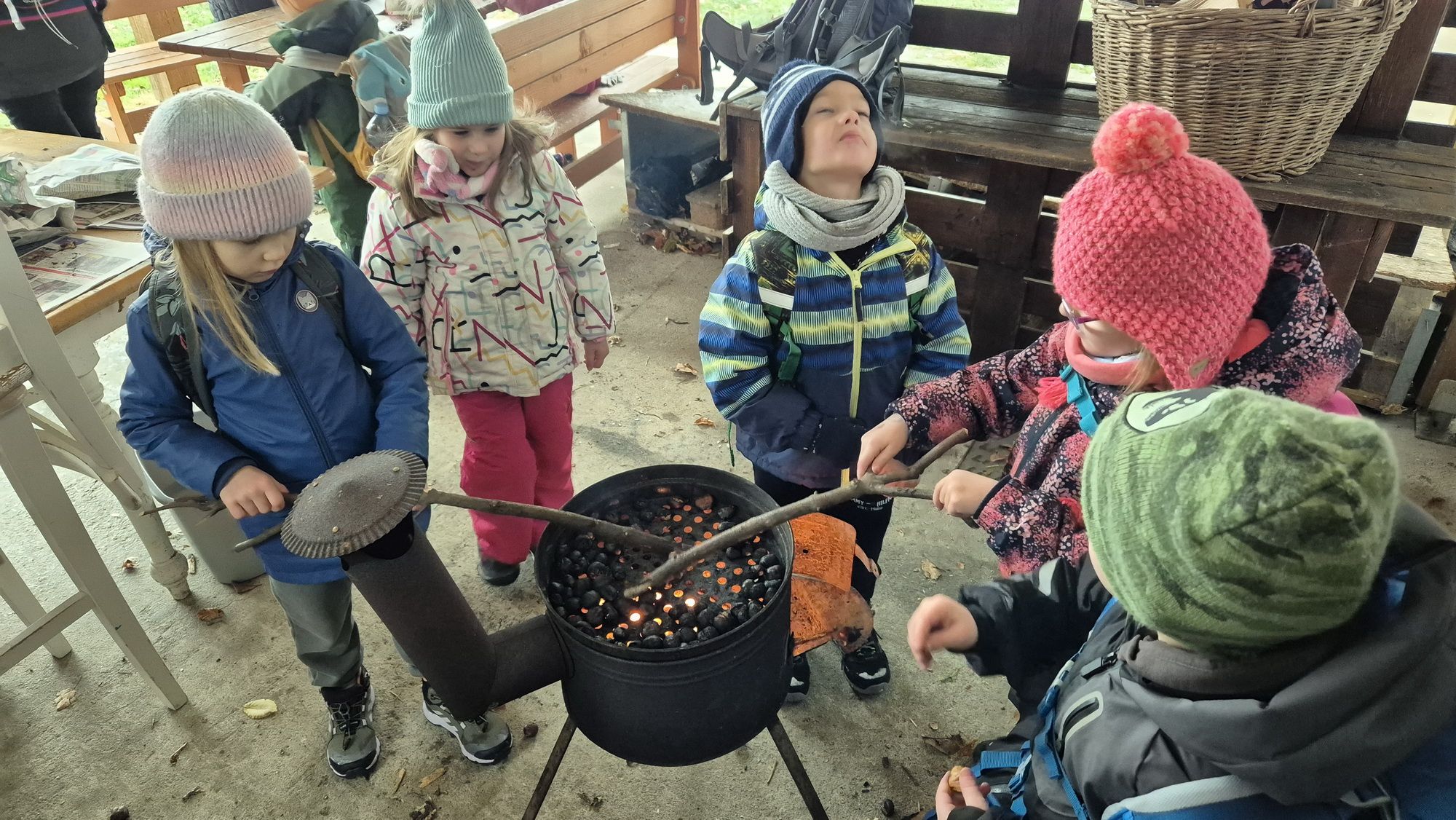Fotoutrinki s sobotnega, zelo lepega izleta. Upali smo na jesenski izlet, a dobili zgodnje-zimskega. Pozdravilo nas je hladno jutro, a se nismo dali, kmalu smo jo urezali v hrib, se malo zadihali, da nam je postalo toplo in že je bil čas za zajtrk. V ozadju so nas spremljale meglice, a kljub temu smo lahko videli kar daleč, tla so bila rahlo pobeljena, a to nas ni ustavilo, da se ne bi v gozdu tudi poigrali in plezali po strmih hribčkih in koreninah. Kmalu smo prispeli na vrh, kjer smo se z rdečimi lici najprej odpravili na toplo in se konkretno pogreli pri Hudi Lizi. Tudi prigriznili smo, kar je še ostalo. Zunaj pa se je že razplamtel ogenj, kjer so se pekli kostanji. Odpravili smo se na pokušino poznojesenskih kostanjev in uživali v igri na snegu in kepanju. Otroci so res uživali in zelo luštno jih je bilo opazovati v spontani igri. Narava je resnično najboljše igrišče.