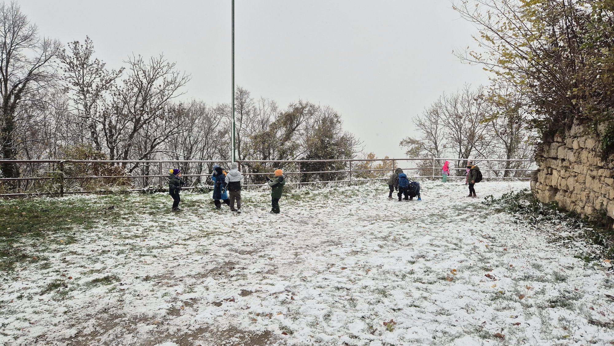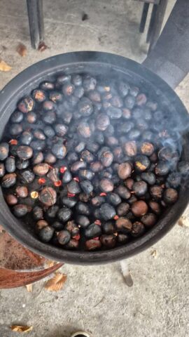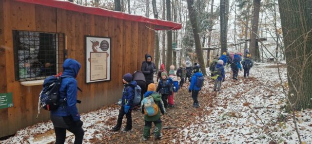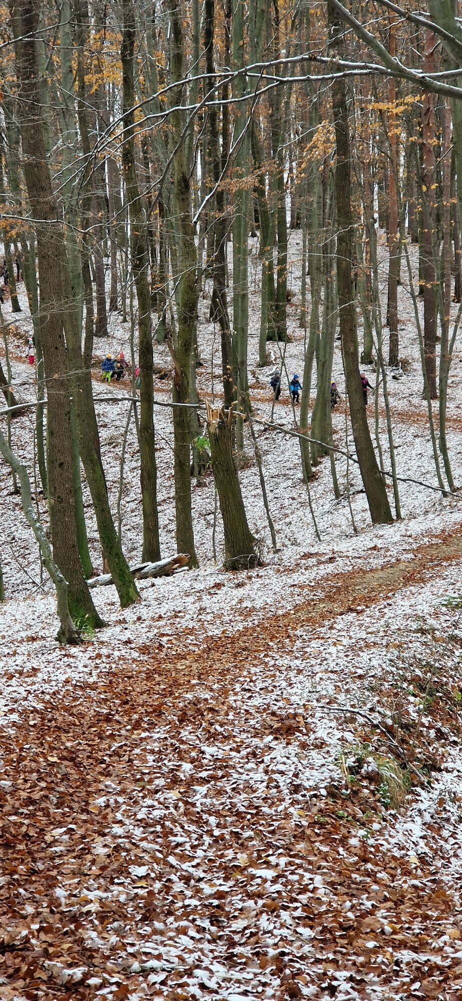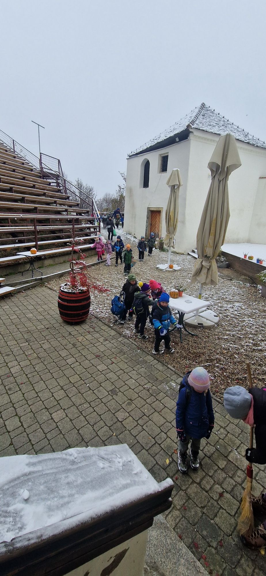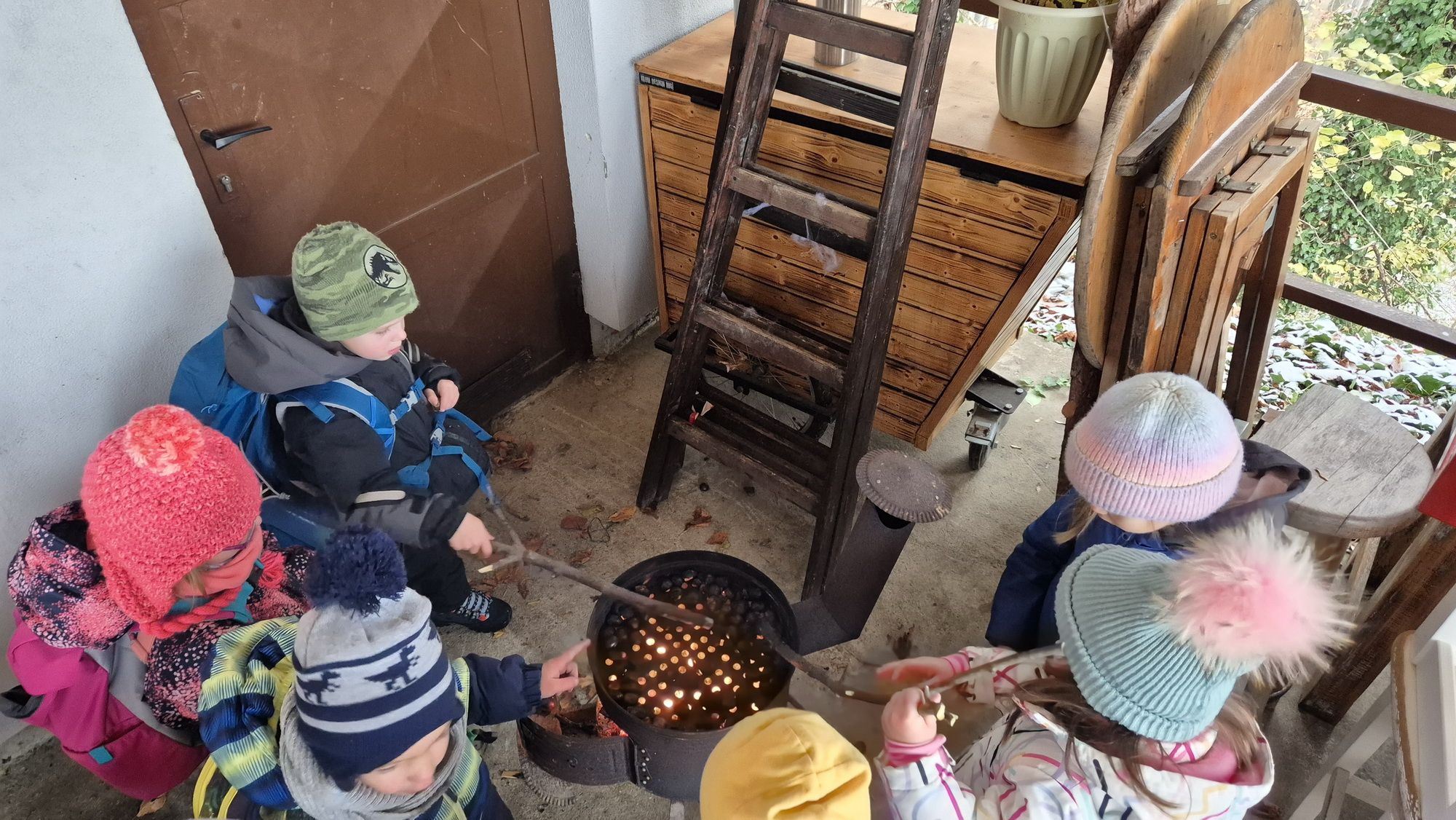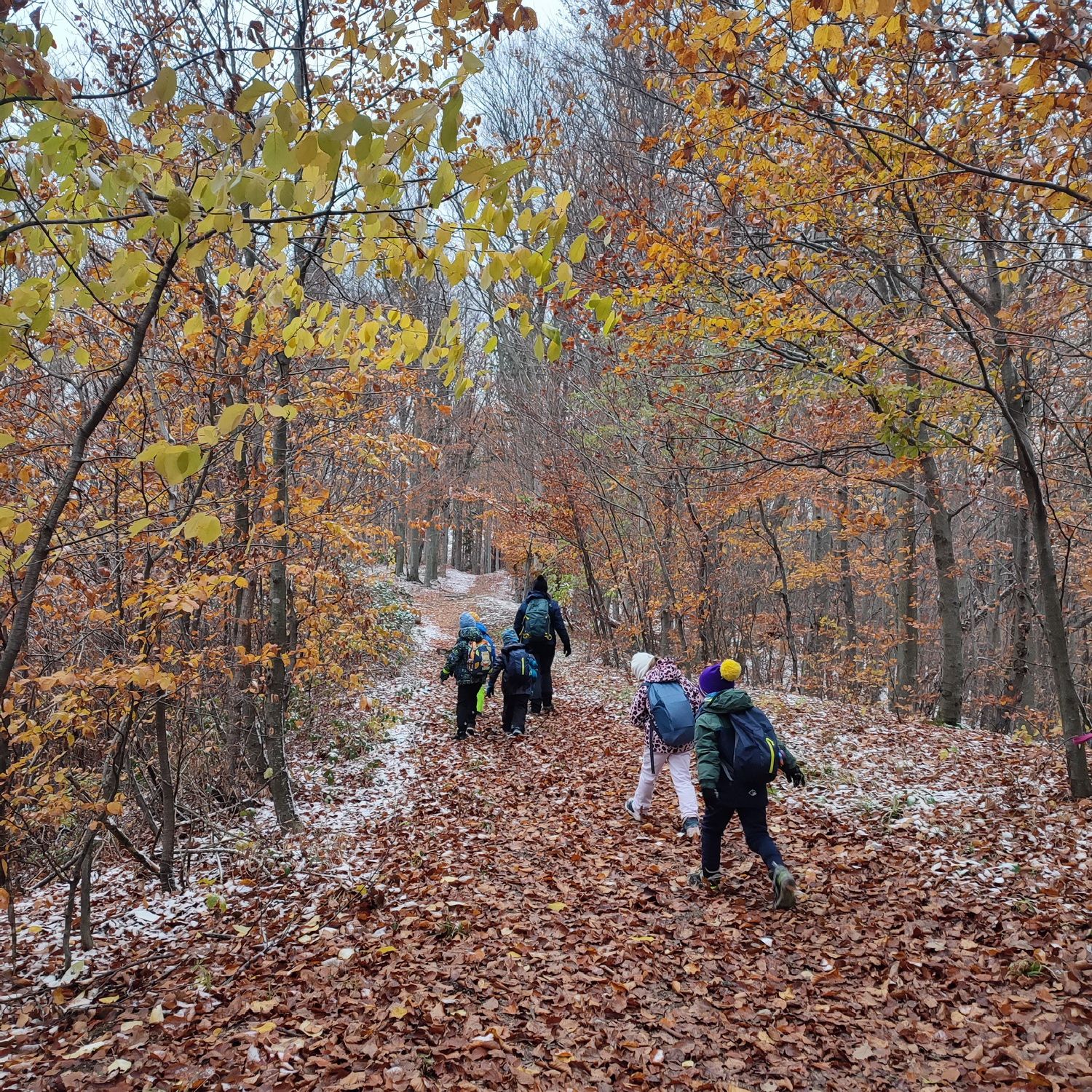 Fotoutrinki s sobotnega, zelo lepega izleta. Upali smo na jesenski izlet, a dobili zgodnje-zimskega. Pozdravilo nas je hladno jutro, a se nismo dali, kmalu smo jo urezali v hrib, se malo zadihali, da nam je postalo toplo in že je bil čas za zajtrk. V ozadju so nas spremljale meglice, a kljub temu smo lahko videli kar daleč, tla so bila rahlo pobeljena, a to nas ni ustavilo, da se ne bi v gozdu tudi poigrali in plezali po strmih hribčkih in koreninah. Kmalu smo prispeli na vrh, kjer smo se z rdečimi lici najprej odpravili na toplo in se konkretno pogreli pri Hudi Lizi. Tudi prigriznili smo, kar je še ostalo. Zunaj pa se je že razplamtel ogenj, kjer so se pekli kostanji. Odpravili smo se na pokušino poznojesenskih kostanjev in uživali v igri na snegu in kepanju. Otroci so res uživali in zelo luštno jih je bilo opazovati v spontani igri. Narava je resnično najboljše igrišče.