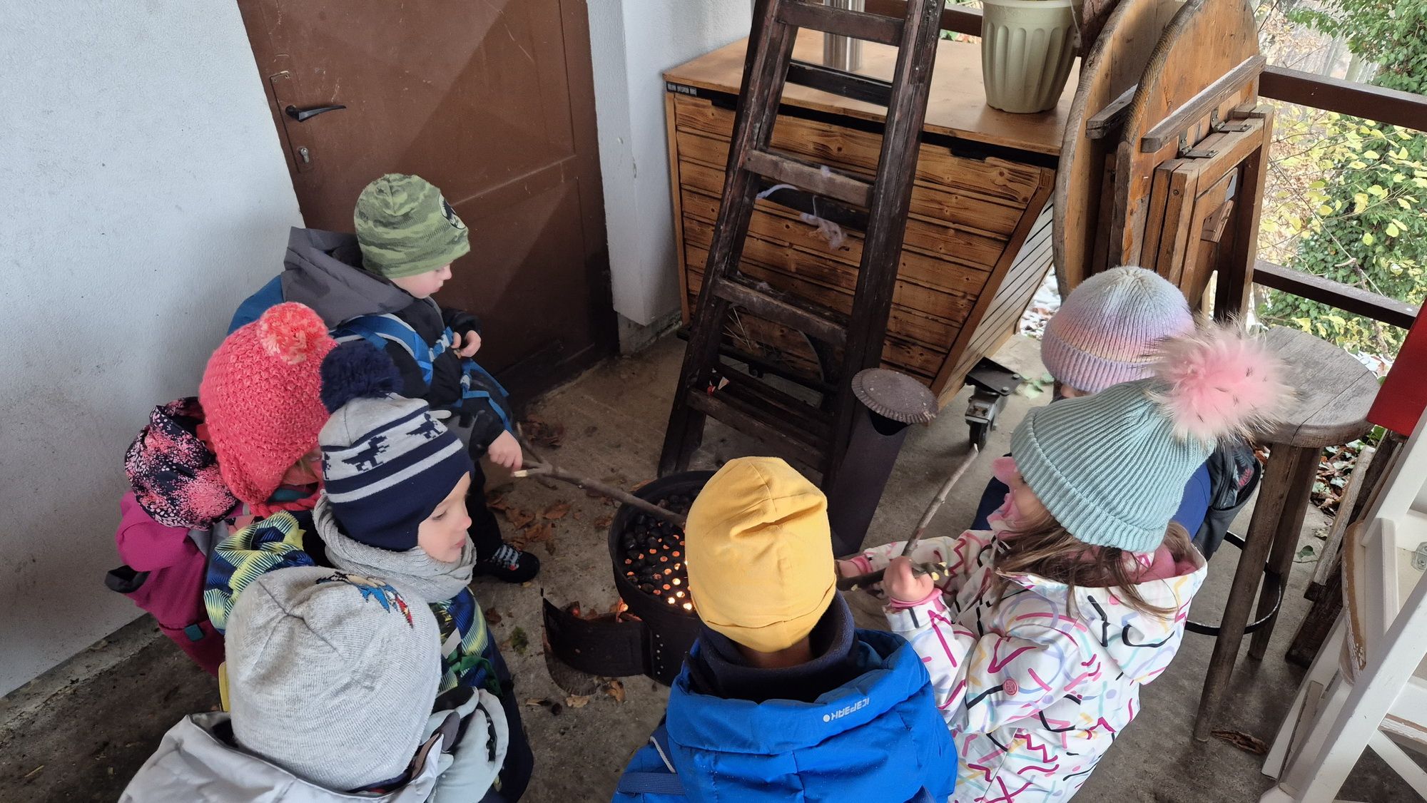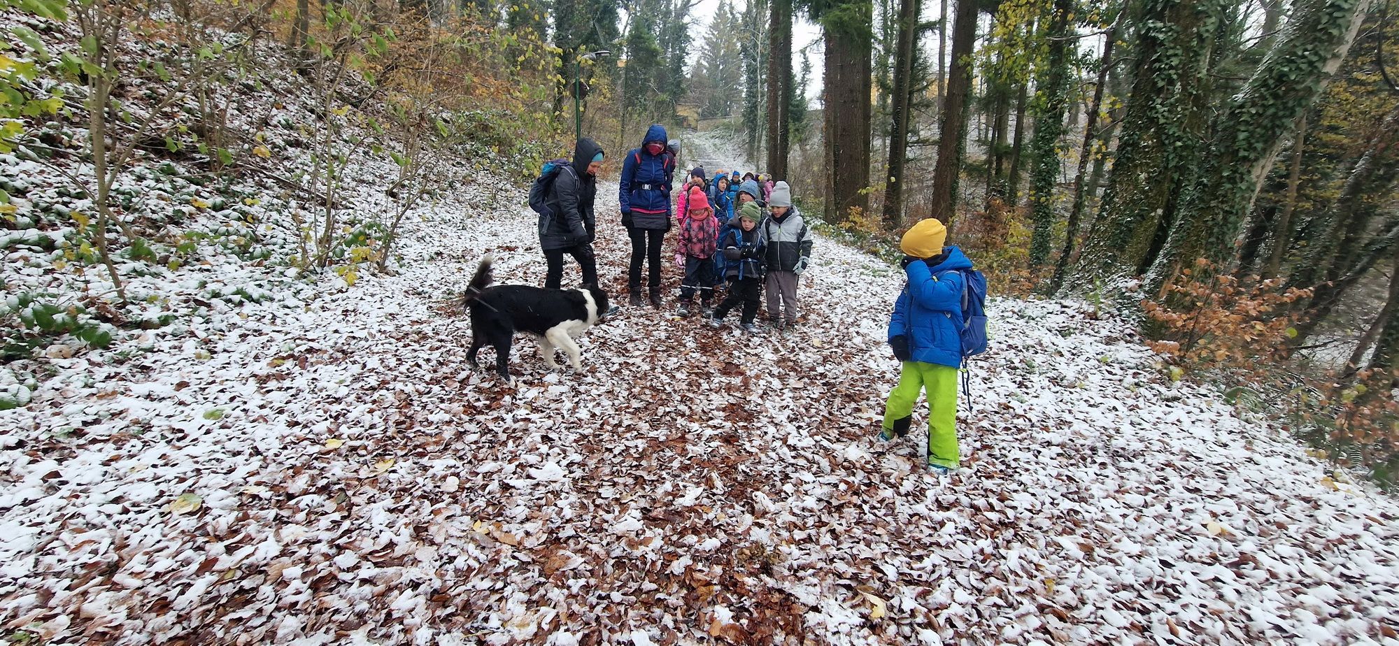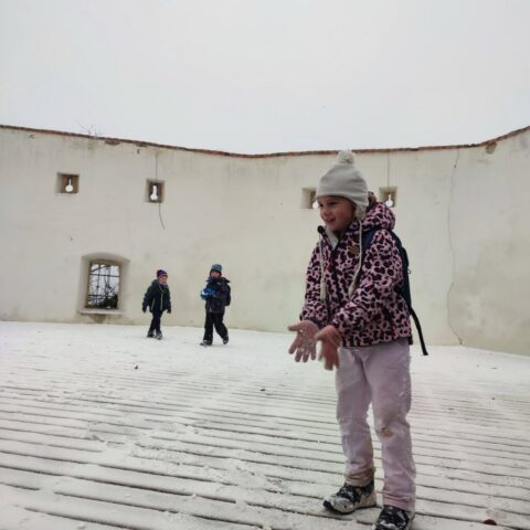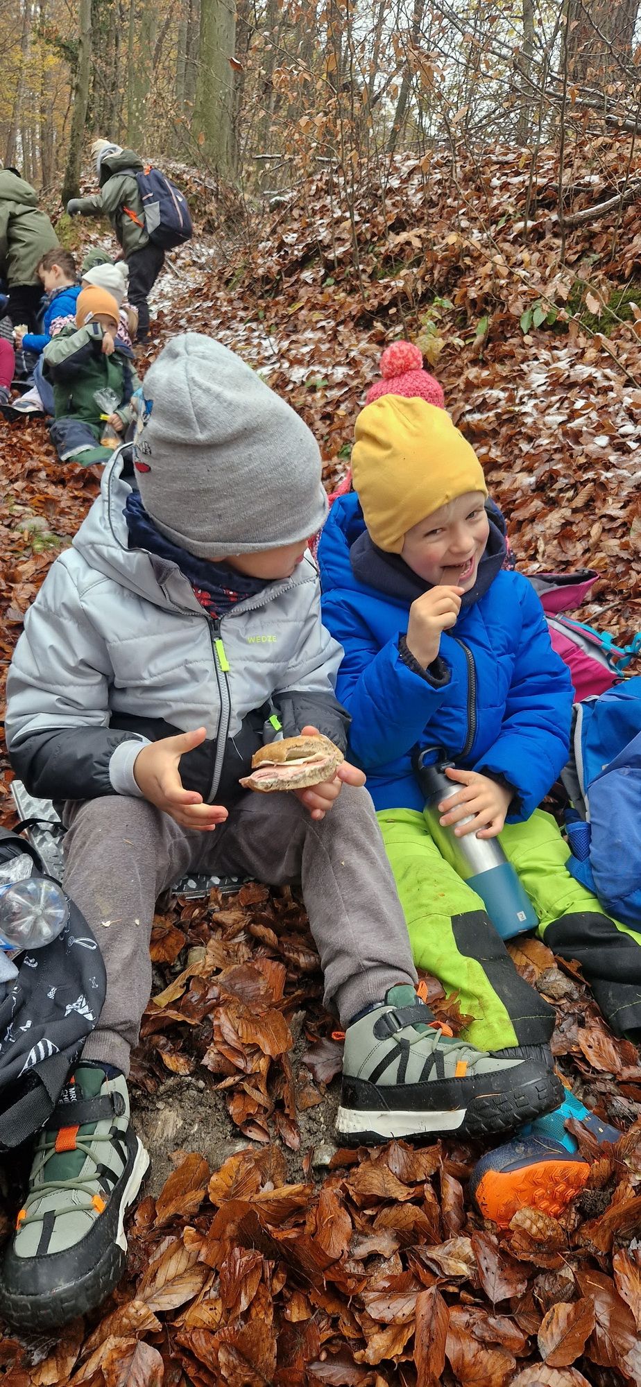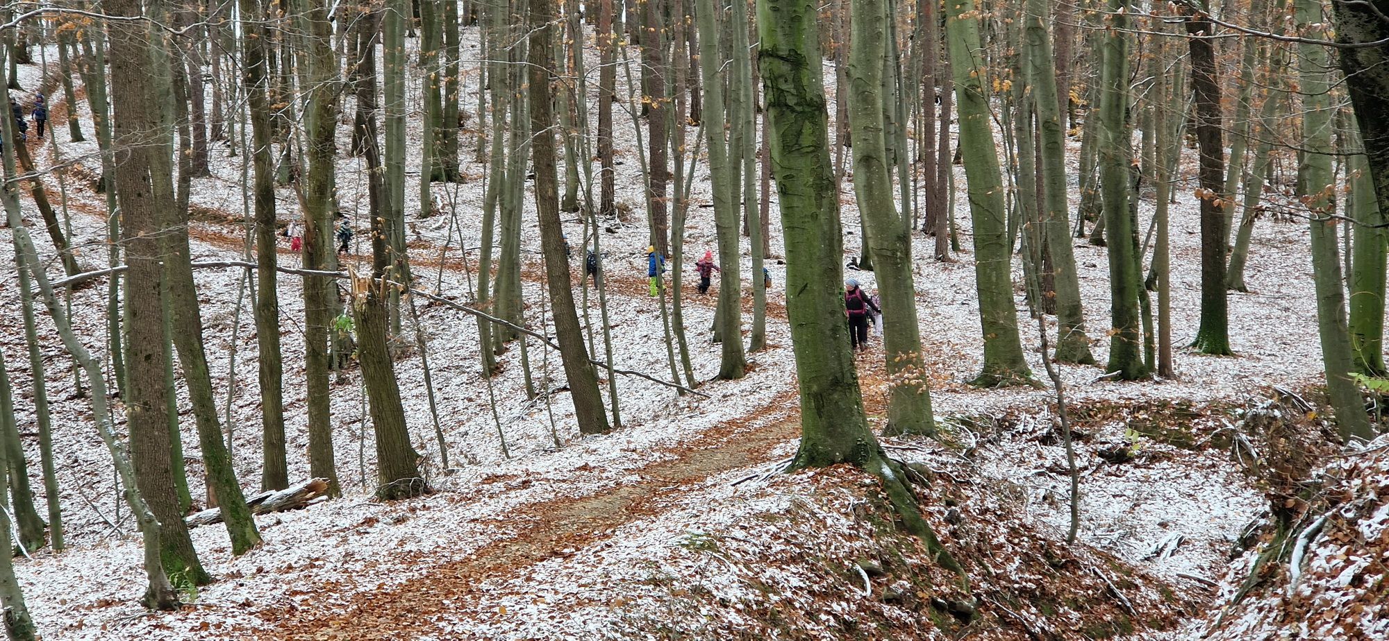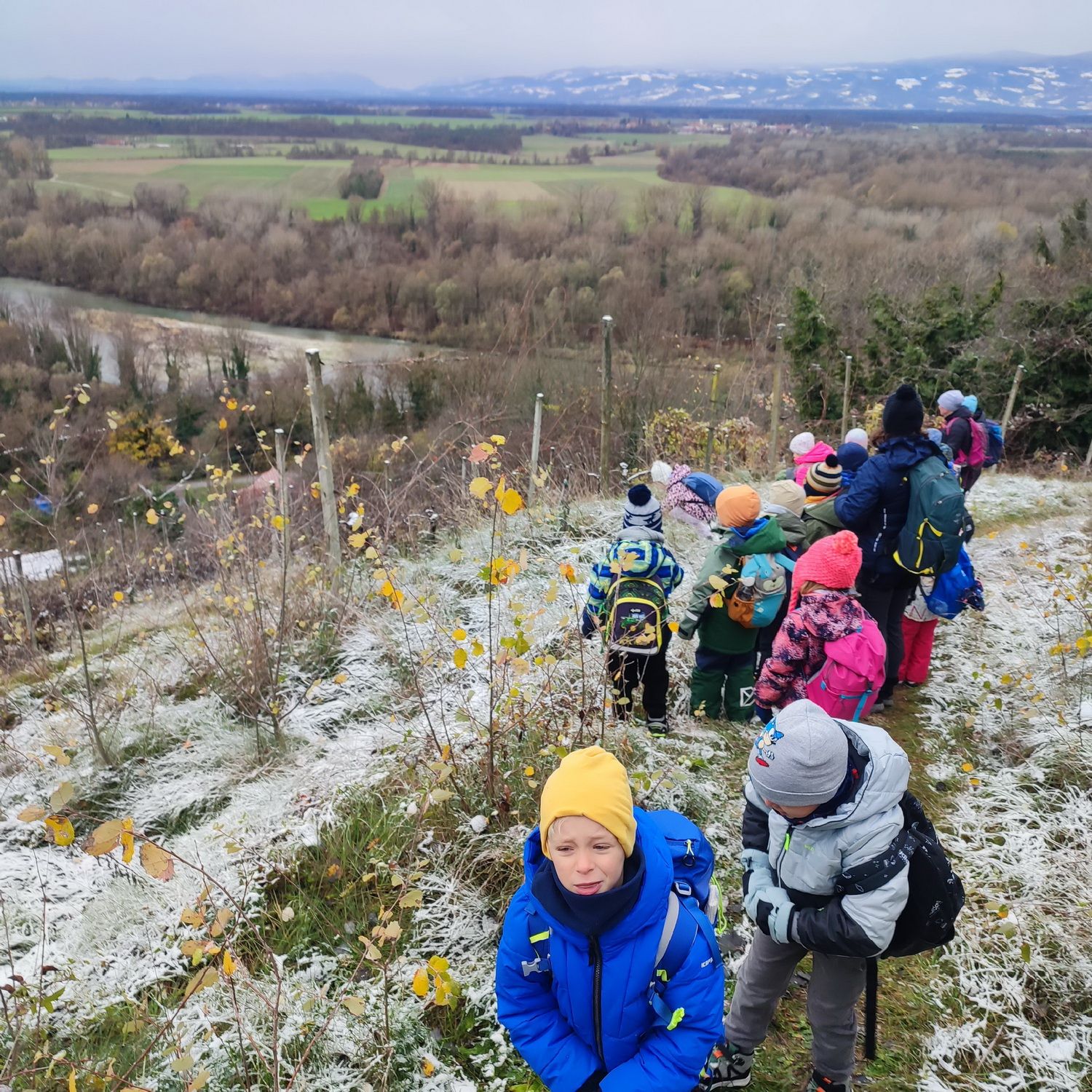 Fotoutrinki s sobotnega, zelo lepega izleta. Upali smo na jesenski izlet, a dobili zgodnje-zimskega. Pozdravilo nas je hladno jutro, a se nismo dali, kmalu smo jo urezali v hrib, se malo zadihali, da nam je postalo toplo in že je bil čas za zajtrk. V ozadju so nas spremljale meglice, a kljub temu smo lahko videli kar daleč, tla so bila rahlo pobeljena, a to nas ni ustavilo, da se ne bi v gozdu tudi poigrali in plezali po strmih hribčkih in koreninah. Kmalu smo prispeli na vrh, kjer smo se z rdečimi lici najprej odpravili na toplo in se konkretno pogreli pri Hudi Lizi. Tudi prigriznili smo, kar je še ostalo. Zunaj pa se je že razplamtel ogenj, kjer so se pekli kostanji. Odpravili smo se na pokušino poznojesenskih kostanjev in uživali v igri na snegu in kepanju. Otroci so res uživali in zelo luštno jih je bilo opazovati v spontani igri. Narava je resnično najboljše igrišče.
