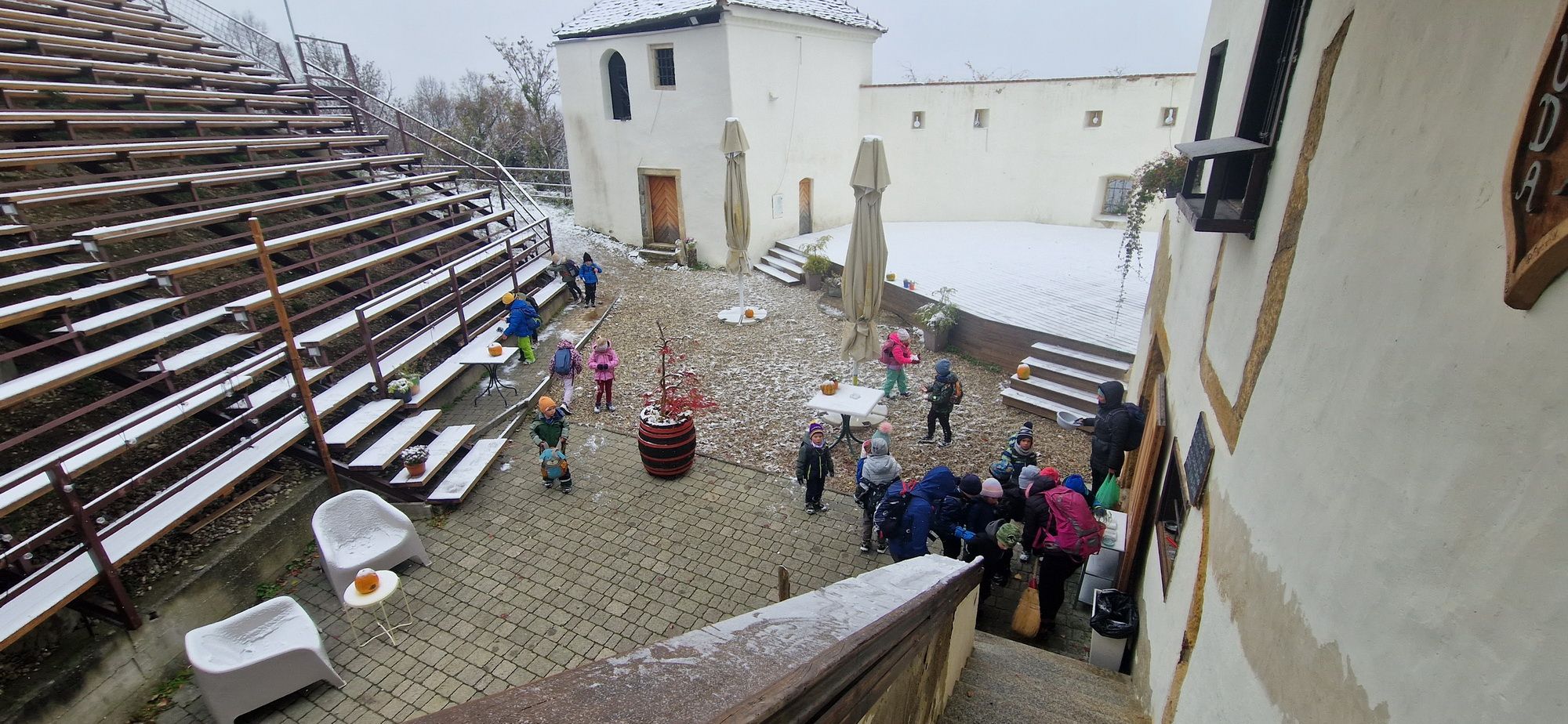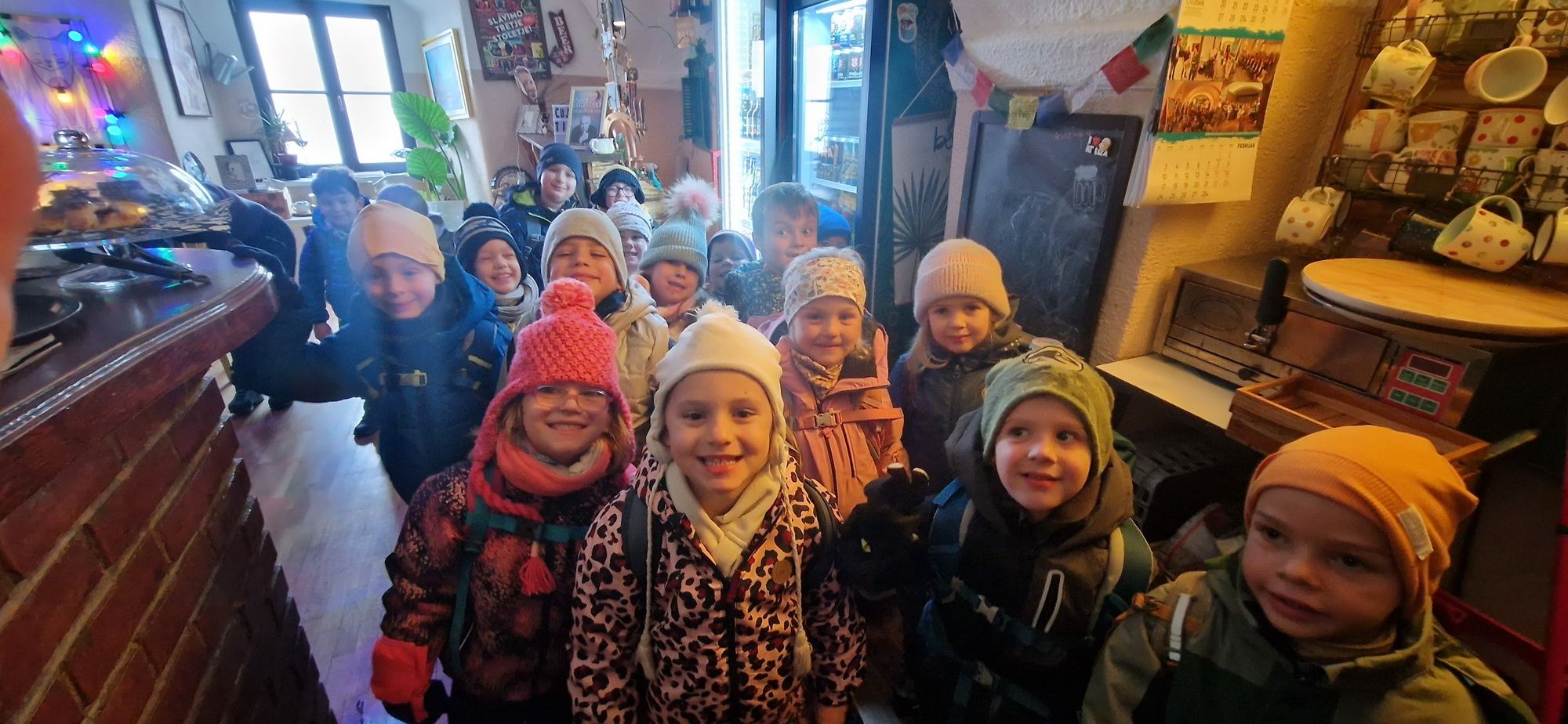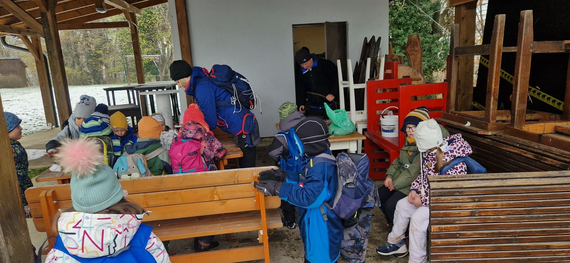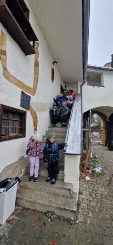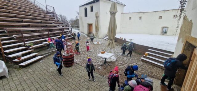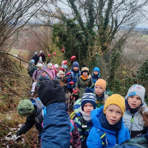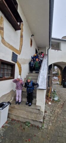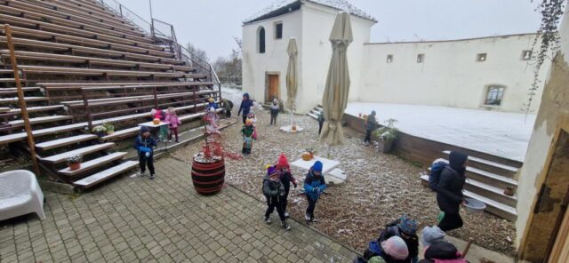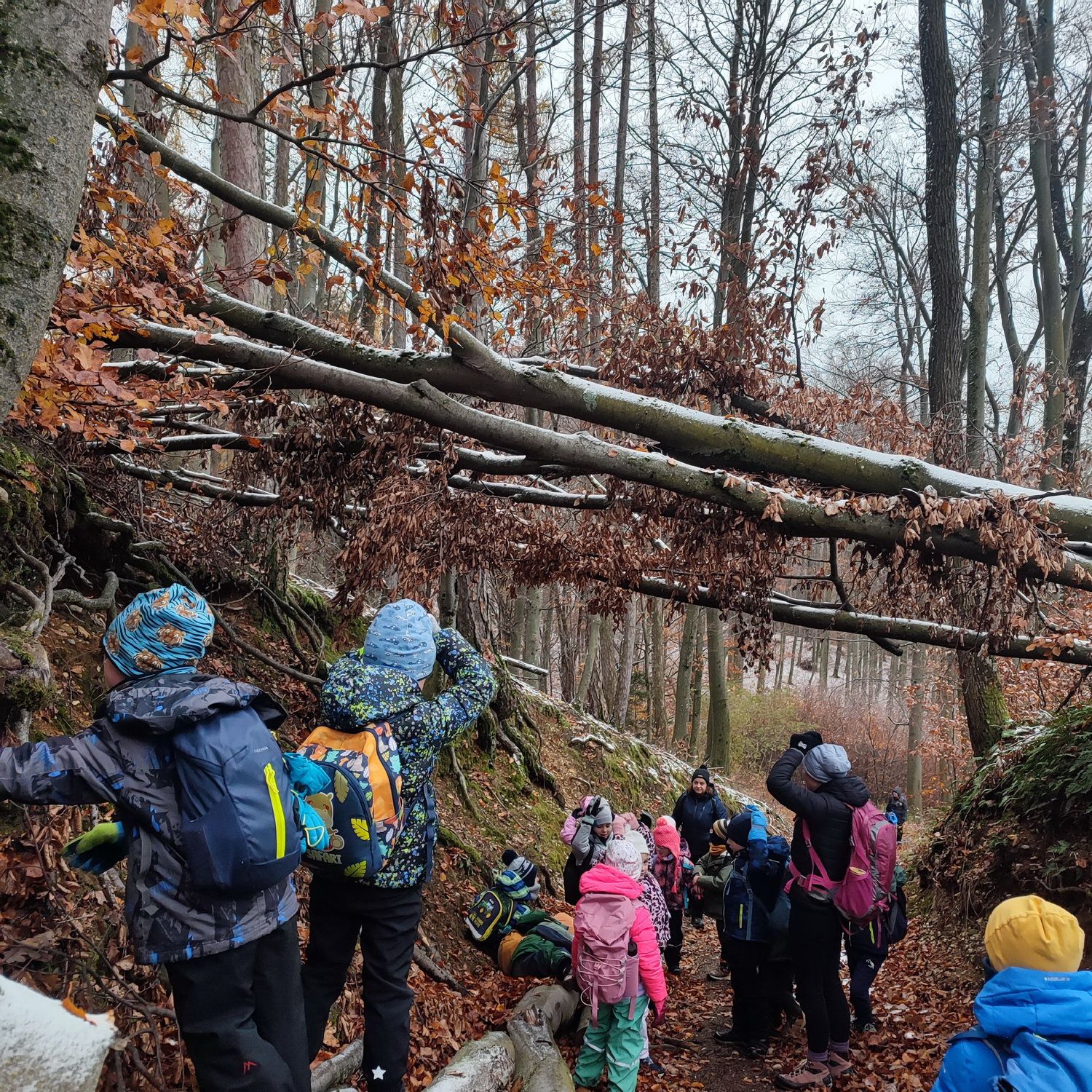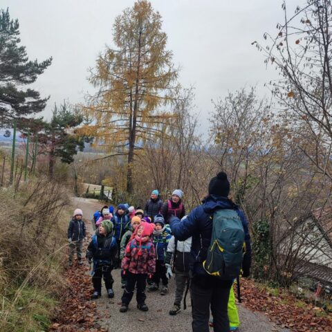 Fotoutrinki s sobotnega, zelo lepega izleta. Upali smo na jesenski izlet, a dobili zgodnje-zimskega. Pozdravilo nas je hladno jutro, a se nismo dali, kmalu smo jo urezali v hrib, se malo zadihali, da nam je postalo toplo in že je bil čas za zajtrk. V ozadju so nas spremljale meglice, a kljub temu smo lahko videli kar daleč, tla so bila rahlo pobeljena, a to nas ni ustavilo, da se ne bi v gozdu tudi poigrali in plezali po strmih hribčkih in koreninah. Kmalu smo prispeli na vrh, kjer smo se z rdečimi lici najprej odpravili na toplo in se konkretno pogreli pri Hudi Lizi. Tudi prigriznili smo, kar je še ostalo. Zunaj pa se je že razplamtel ogenj, kjer so se pekli kostanji. Odpravili smo se na pokušino poznojesenskih kostanjev in uživali v igri na snegu in kepanju. Otroci so res uživali in zelo luštno jih je bilo opazovati v spontani igri. Narava je resnično najboljše igrišče.